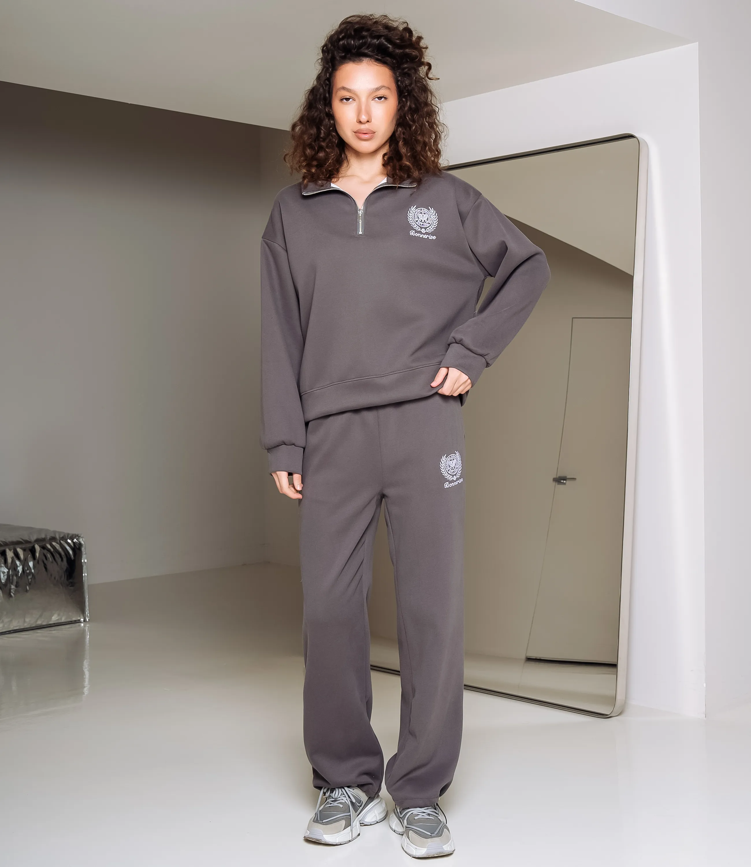 Спортивный костюм – это одежда, которая подчеркивает стиль и комфорт каждой женщины. Свитшот свободного кроя с воротом‑стойкой и короткой центральной молнией, манжетами на рукавах и резинкой по низу, крупная вышивка эмблемы на груди, мягкий трикотаж средней плотности; брюки прямого фасона с эластичным поясом на кулиске, боковыми врезными карманами и чуть расширяющимися штанинами до щиколотки; плоские швы и усиленные внутренние швы обеспечивают комфорт, тепло и свободу движений. Для изготовления использованы ткани 65% хлопок и 35% полиэстер, который характеризуются отличным качеством и дышащими свойствами. Даже после множества стирок изделие не утратит первоначальной красоты. Вы будете носить его с радостью. Обратите внимание на цвет. Он полностью соответствуют фотографии на сайте. Чтобы вы были уверены в размере, мы представили на странице таблицу. Воспользовавшись ею, вы сможете сами обмерить себя и удостовериться. Установленная нами цена является приемлемой. Не откажите себе в удовольствии быть стильной и комфортной!