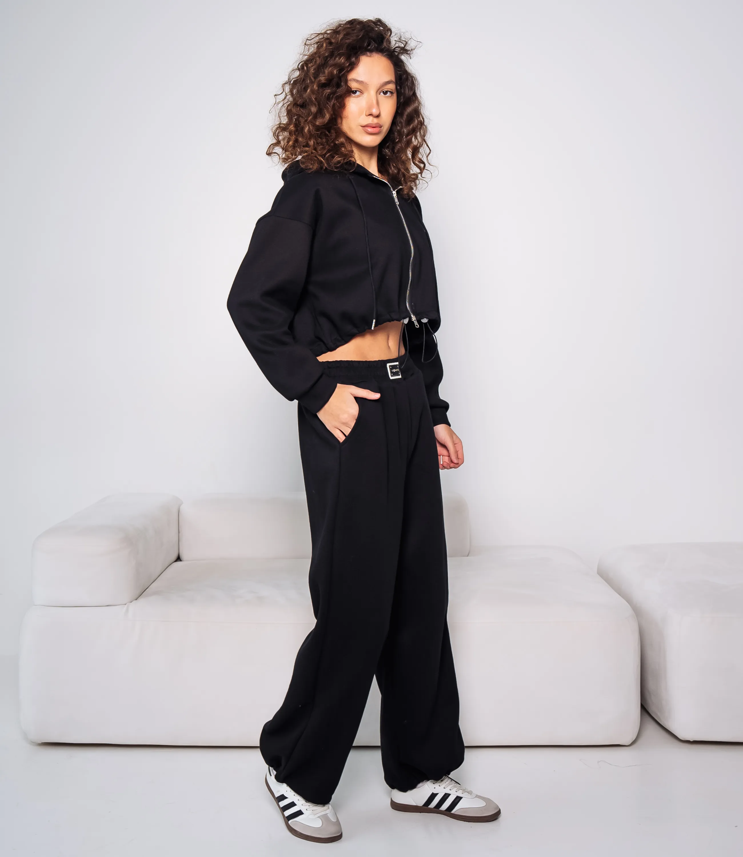 Спортивный костюм – это одежда, которая подчеркивает стиль и комфорт каждой женщины. Укороченный худи на центральной молнии с капюшоном и шнурком, с опущенной линией плеча и длинными рукавами с эластичными манжетами, нижний край худи фиксируется кулиской со стяжкой; свободные прямые брюки с высокой посадкой, широким эластичным поясом и внутренней фиксацией, врезные боковые карманы и эластичные манжеты внизу штанин. Для изготовления использованы ткани 65% хлопок и 35% полиэстер, который характеризуются отличным качеством и дышащими свойствами. Даже после множества стирок изделие не утратит первоначальной красоты. Вы будете носить его с радостью. Обратите внимание на цвет. Он полностью соответствуют фотографии на сайте. Чтобы вы были уверены в размере, мы представили на странице таблицу. Воспользовавшись ею, вы сможете сами обмерить себя и удостовериться. Установленная нами цена является приемлемой. Не откажите себе в удовольствии быть стильной и комфортной!