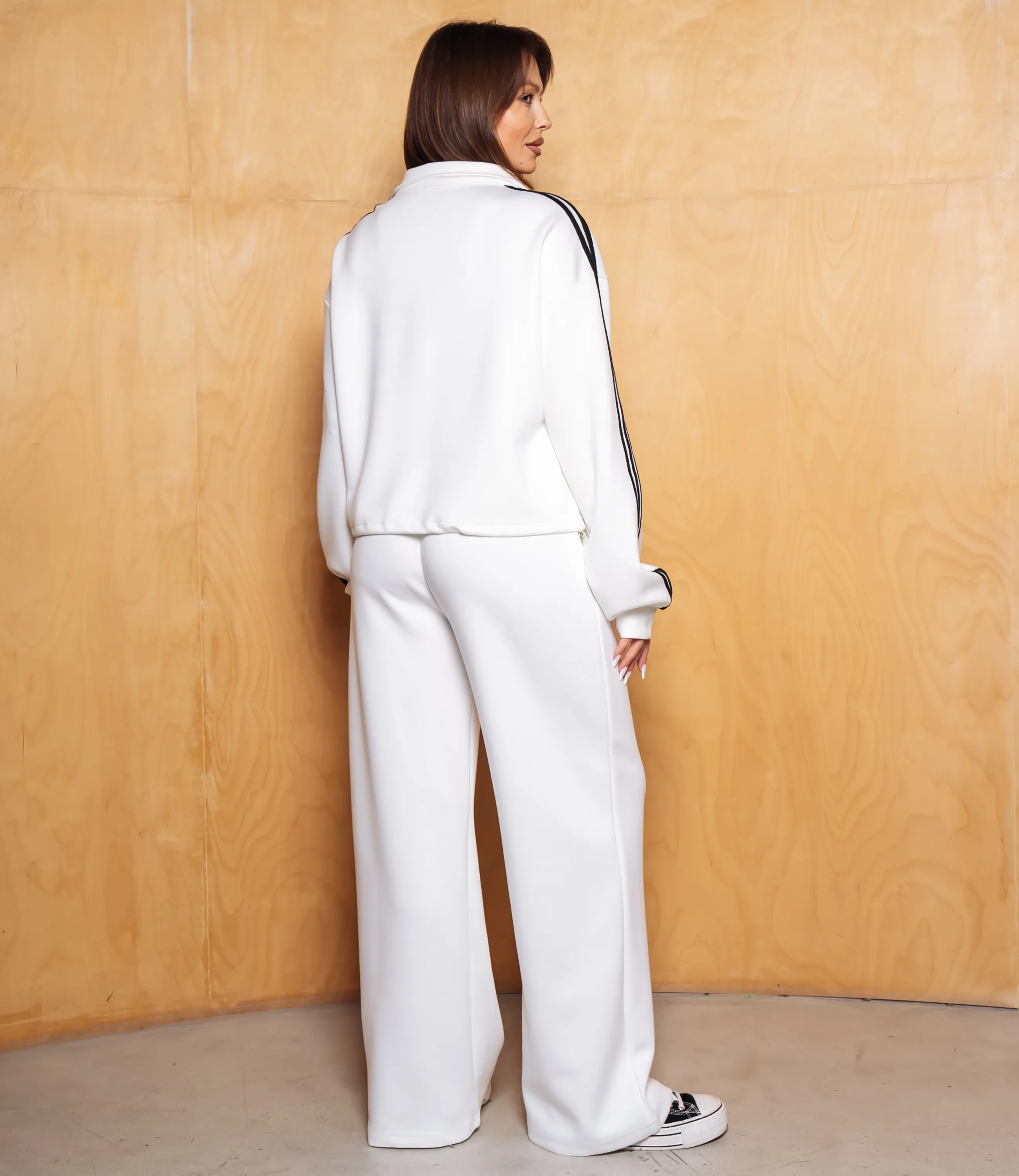 Спортивный костюм – это одежда, которая подчеркивает стиль и комфорт каждой женщины. Спортивный костюм в спортивно‑повседневном стиле, состоящий из укорочённого свитшота с подбором на молнии и прямых свободных брюк, выполнен из плотного эластичного полотна среднего веса с мягкой фактурой, хорошо держащего форму; свитшот имеет полуворотник-стойку с короткой функциональной молнией по центру груди, при расстёгивании образуется V‑образный вырез, линия плеча слегка опущена для расслабленного силуэта, длина до линии талии с немного широким, но не обтягивающим кроем; рукава цельнокроеные, длинные и свободные с манжетами, по внешней стороне каждой рукава тянутся три продольные контрастные полосы, запястья оформлены эластичными полосками; на груди небольшая декоративная нашивка или вышивка с логотипом и металлической деталью у молнии, швы аккуратные промышленной строчки. Брюки прямого силуэта с высокой или средней посадкой, по бокам втачные карманы, пояс с внутренней эластичной тесьмой и утягивающим шнурком. Для изготовления использованы ткани 65% хлопок и 35% полиэстер, который характеризуются отличным качеством и дышащими свойствами. Даже после множества стирок изделие не утратит первоначальной красоты. Вы будете носить его с радостью. Обратите внимание на цвет. Он полностью соответствуют фотографии на сайте. Чтобы вы были уверены в размере, мы представили на странице таблицу. Воспользовавшись ею, вы сможете сами обмерить себя и удостовериться. Установленная нами цена является приемлемой. Не откажите себе в удовольствии быть стильной и комфортной!