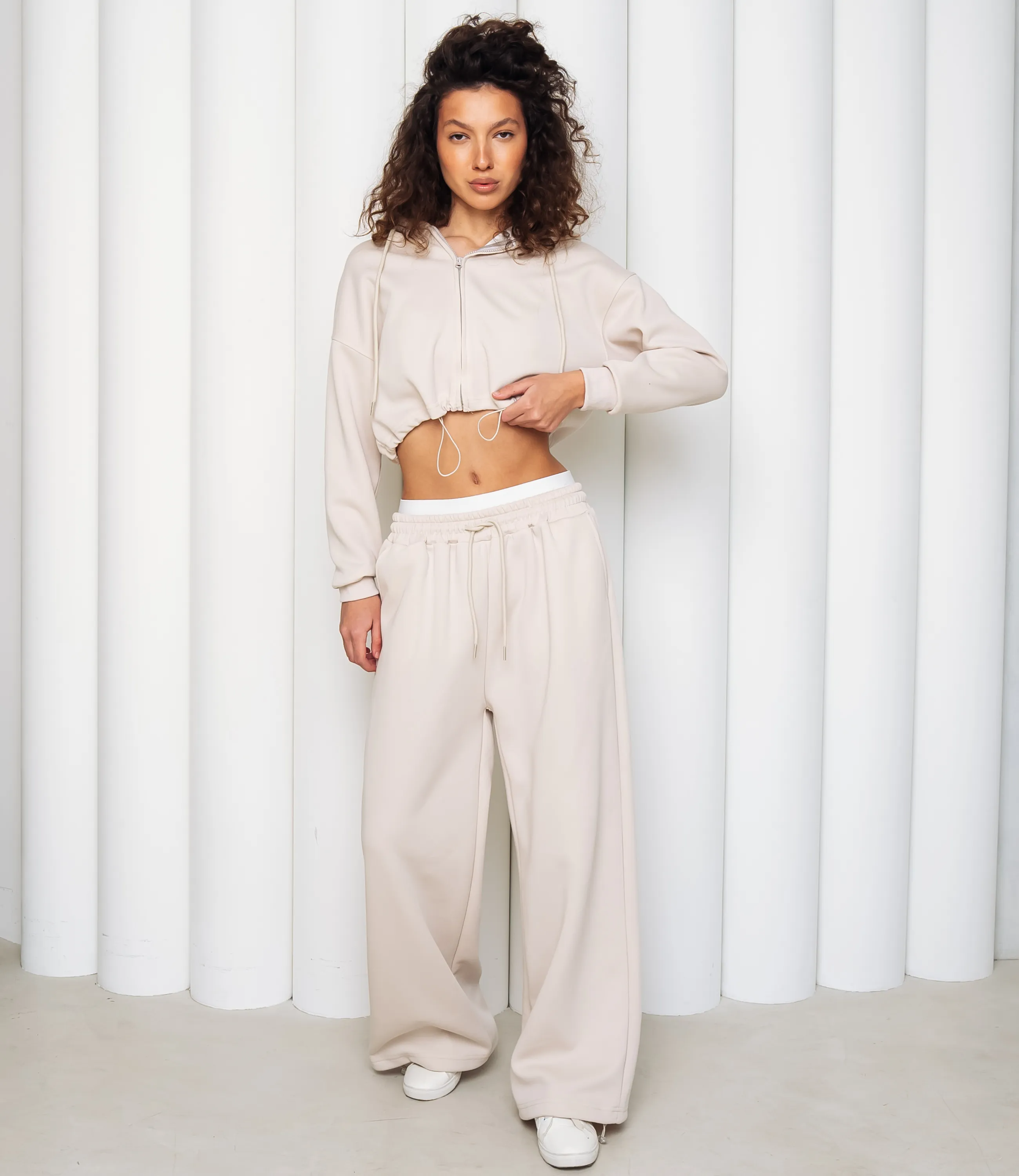 Спортивный костюм – это одежда, которая подчеркивает стиль и комфорт каждой женщины. Укороченный худи на центральной молнии с капюшоном и шнурком, с опущенной линией плеча и длинными рукавами с эластичными манжетами, нижний край худи фиксируется кулиской со стяжкой; свободные прямые брюки с высокой посадкой, широким эластичным поясом и внутренней фиксацией, врезные боковые карманы и эластичные манжеты внизу штанин. Для изготовления использованы ткани 95% хлопок и 5% полиэстер, который характеризуются отличным качеством и дышащими свойствами. Даже после множества стирок изделие не утратит первоначальной красоты. Вы будете носить его с радостью. Обратите внимание на цвет. Он полностью соответствуют фотографии на сайте. Чтобы вы были уверены в размере, мы представили на странице таблицу. Воспользовавшись ею, вы сможете сами обмерить себя и удостовериться. Установленная нами цена является приемлемой. Не откажите себе в удовольствии быть стильной и комфортной!