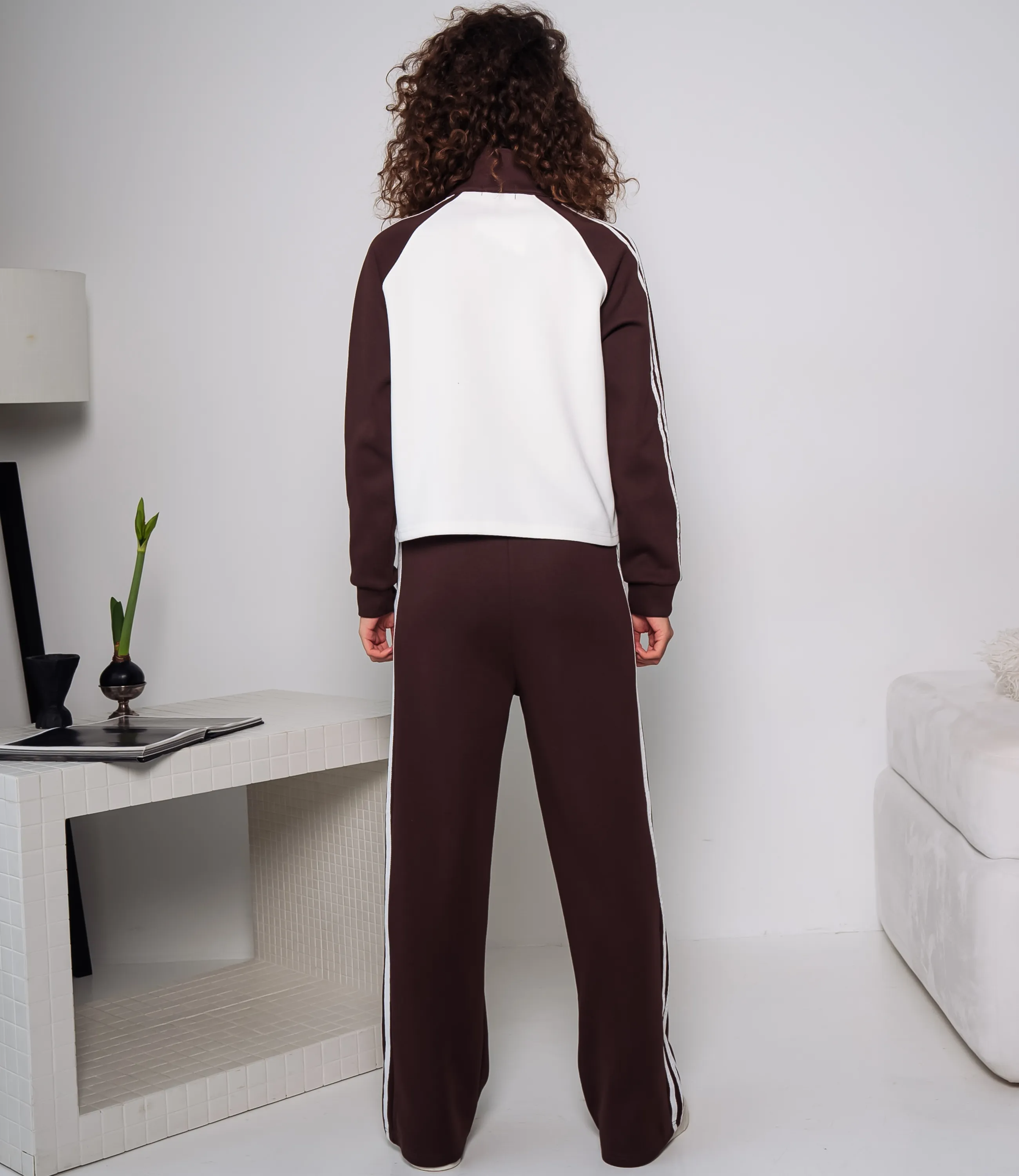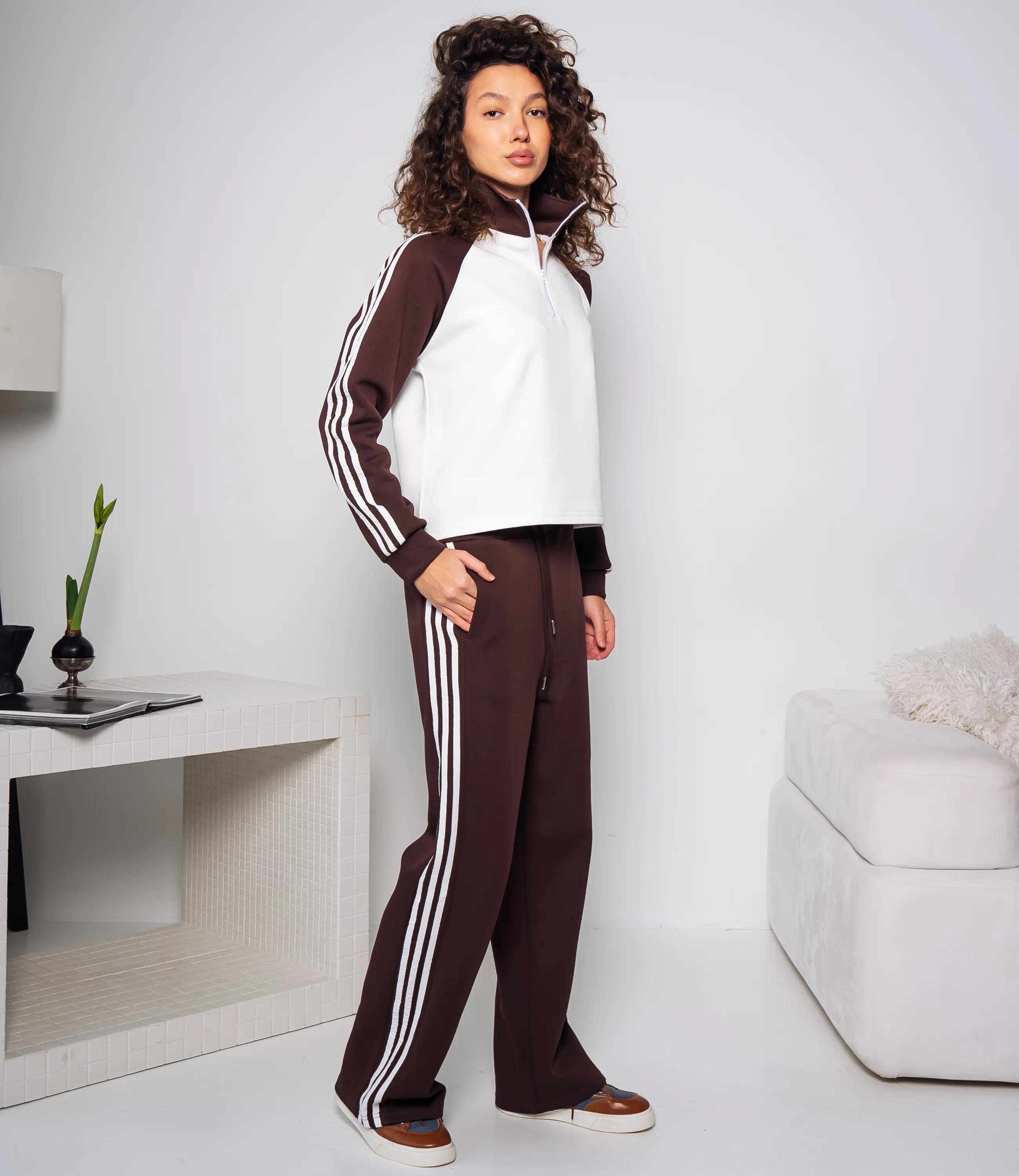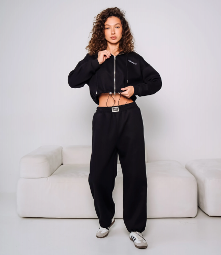 Спортивный костюм – это одежда, которая подчеркивает стиль и комфорт каждой женщины. Спортивный костюм из плотного трикотажа с укороченной толстовкой и прямыми свободными брюками; толстовка имеет высокий круглый ворот с короткой центральной молнией-замком, втачные реглановые рукава с контрастными продольными тесьмами вдоль наружной стороны и манжетами в рубчик, низ изделия слегка укорочен и оформлен простым подгибом; брюки с средней или слегка высокой посадкой, широкий эластичный пояс с наружным шнурком для регулировки. Для изготовления использованы ткани 95% хлопок и 5% спандекс, который характеризуются отличным качеством и дышащими свойствами. Даже после множества стирок изделие не утратит первоначальной красоты. Вы будете носить его с радостью. Обратите внимание на цвет. Он полностью соответствуют фотографии на сайте. Чтобы вы были уверены в размере, мы представили на странице таблицу. Воспользовавшись ею, вы сможете сами обмерить себя и удостовериться. Установленная нами цена является приемлемой. Не откажите себе в удовольствии быть стильной и комфортной!
