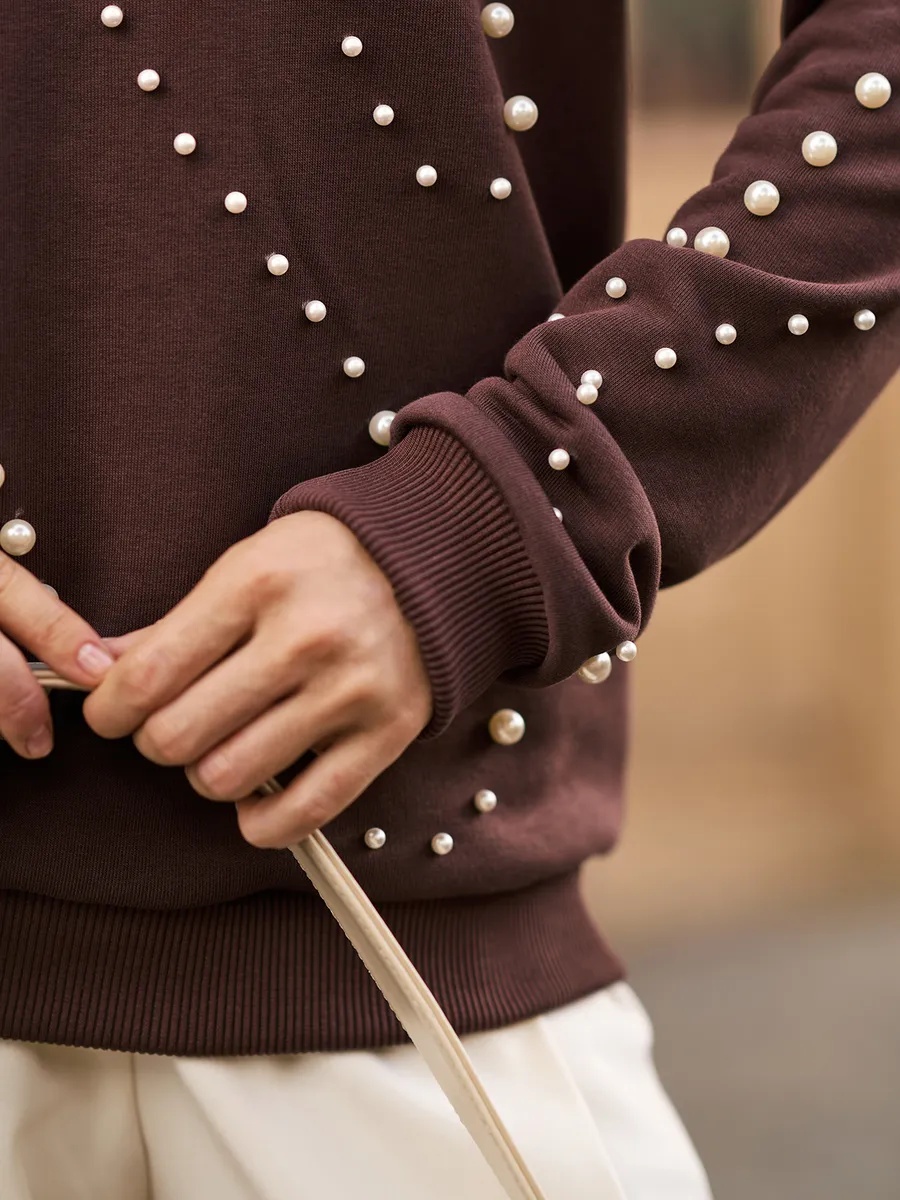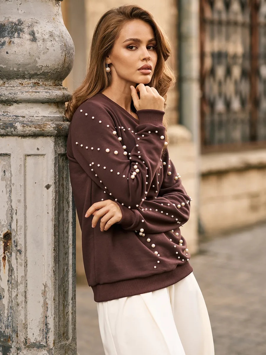 Базовый свитшот с эффектными бусинами-жемчугом — легкая модель для создания расслабленных спокойных образов. Сделан он из приятной для тела футера. Это ткань, которая дышит, гипоаллергенна и не вызывает раздражений. Мягкая и эластичная кулирка хорошо переносит стирки и служит долго. Поэтому можете быть уверены, что изделие с вами на несколько сезонов. Поставщиком ткани для нас является Турция.