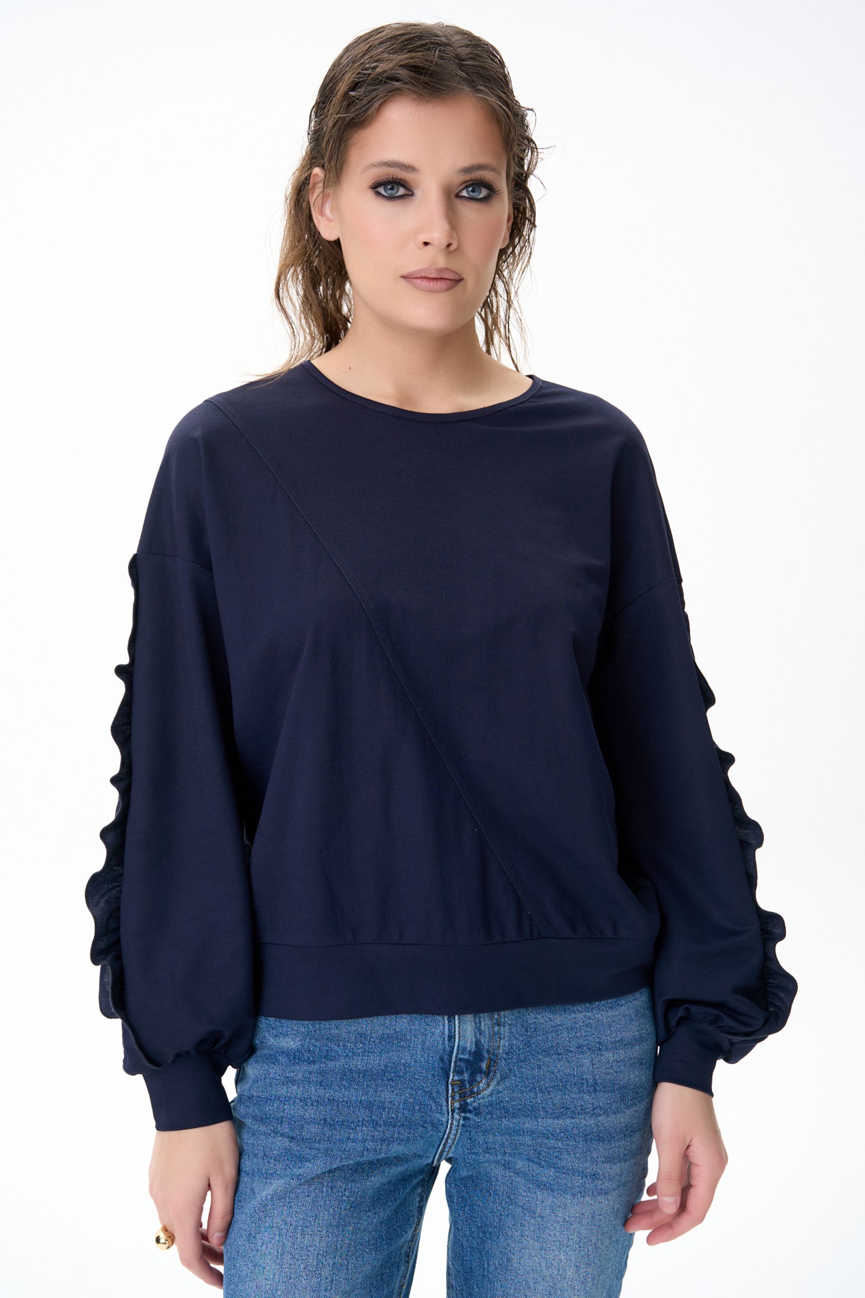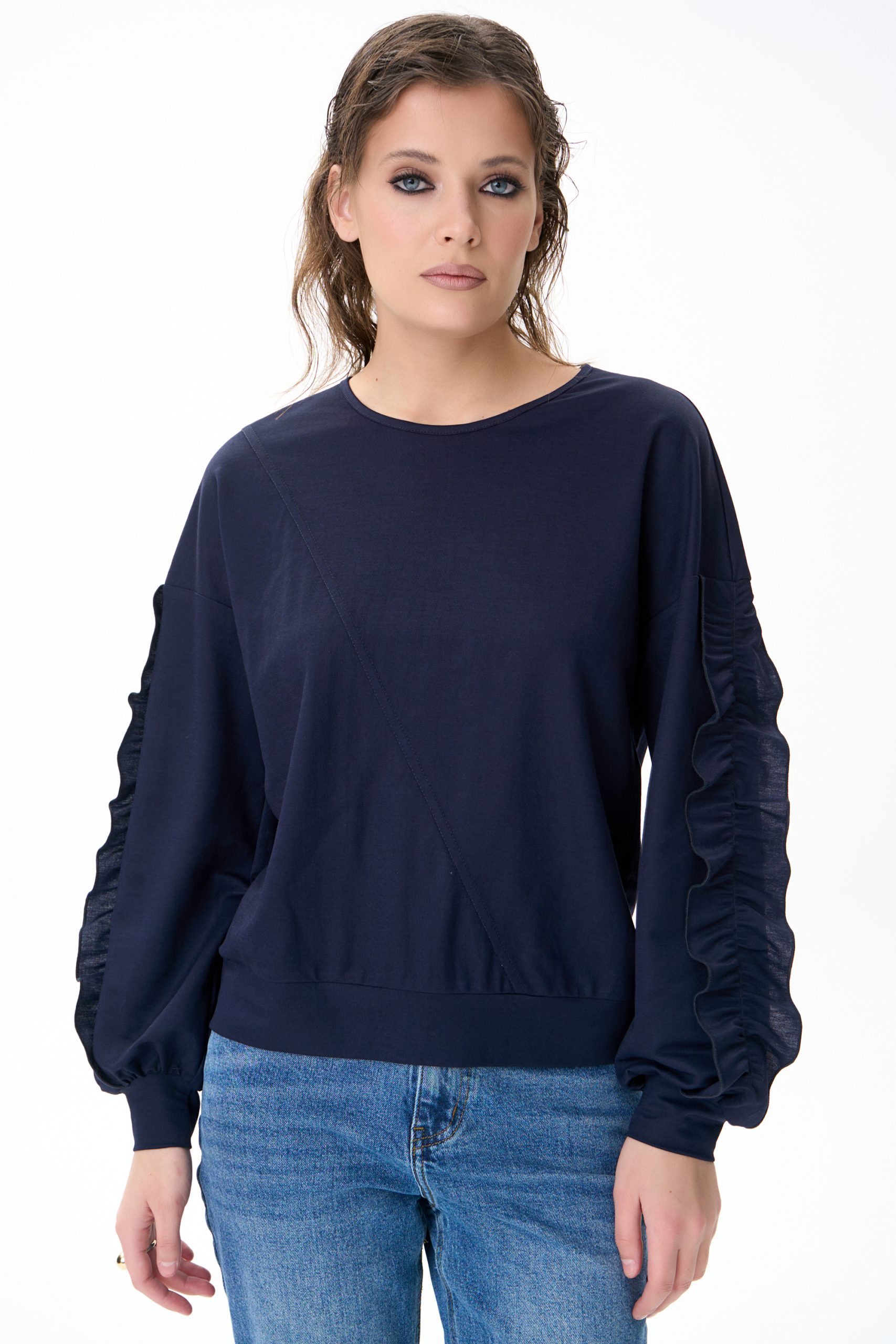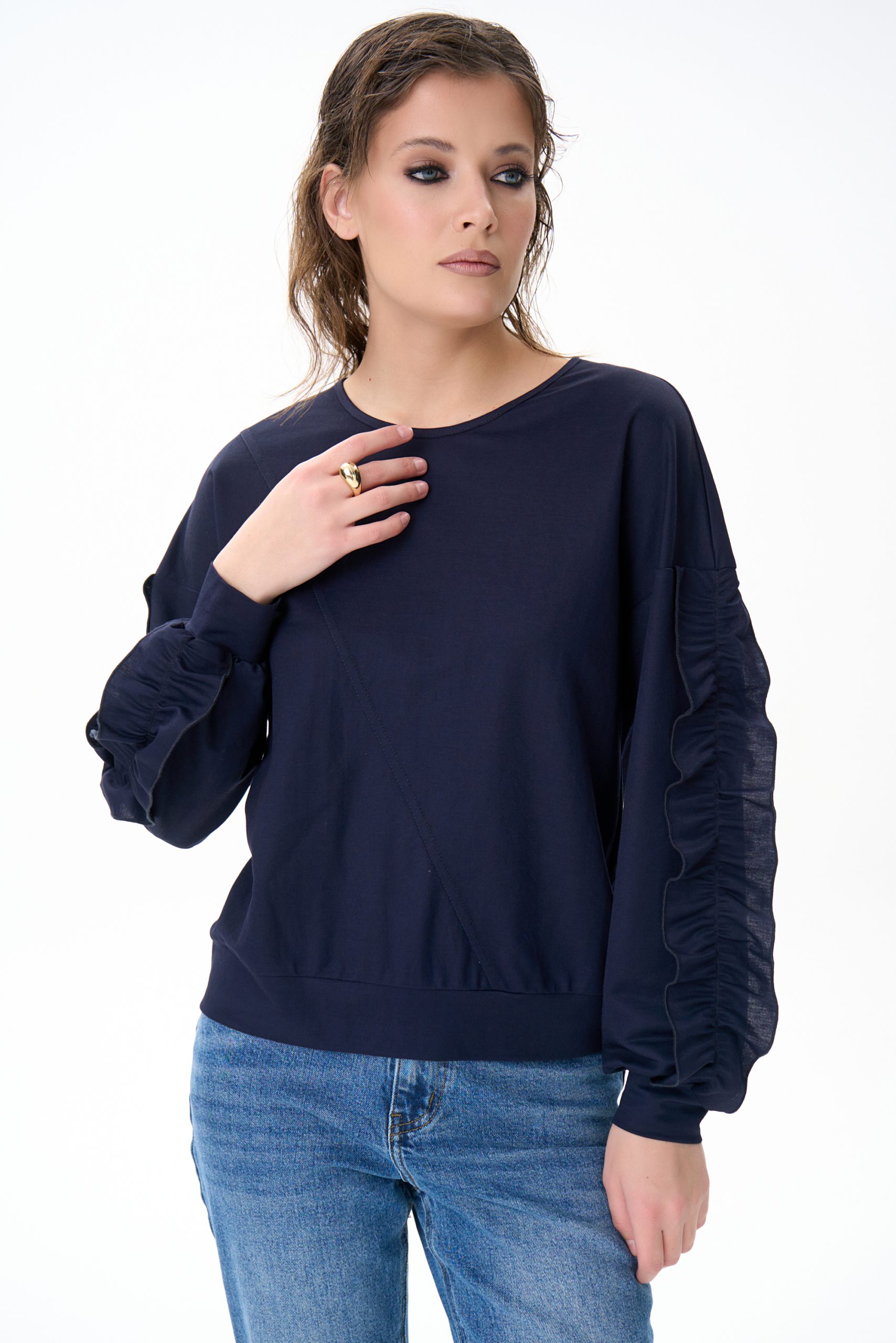 Свитшот «Ния» — мягкий и комфортный, с акцентом на объёмные воланы по рукавах.
