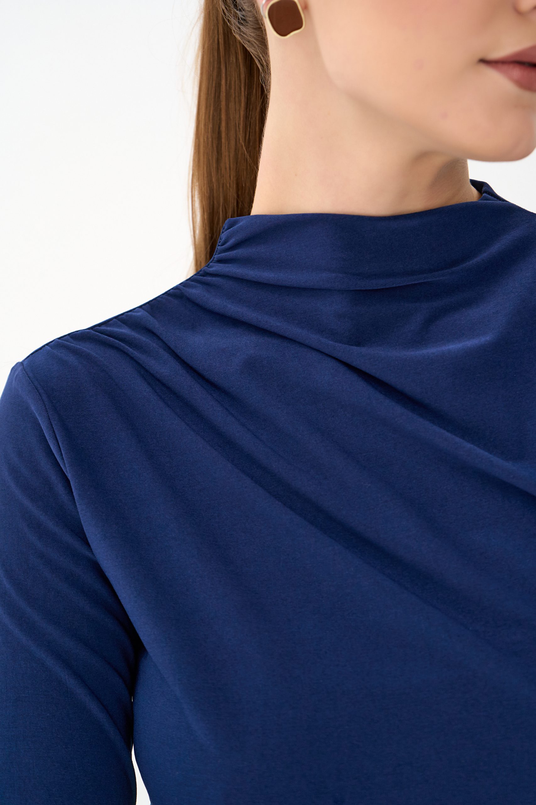 — Особенность модели — асимметричная драпировка по передней части, создающая мягкие складки и визуально вытягивающая верх.
