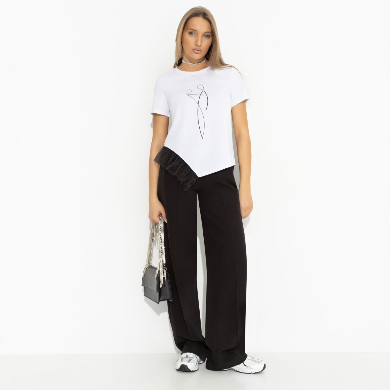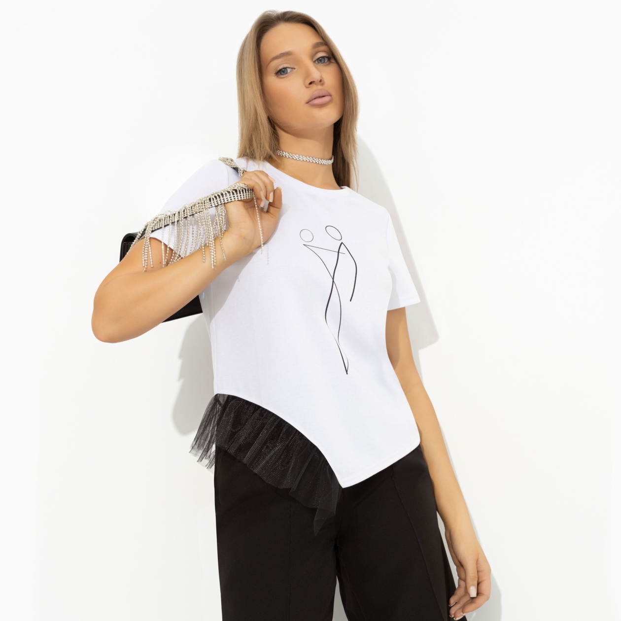 Ловлю комплименты находу! Футболка CHARUTTI создана для легких на подъем, улыбчивых девушек с чувством юмора. И вот я бегу по своим делам, но не устаю замечать знаки внимания в свою сторону. Футболка с асимметричным кроем подола. Одна часть подола дополнена объемными рюшами. Принт напечатан на ткани.