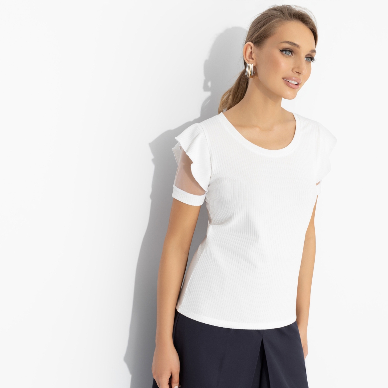 Вы с подругой встретились на праздничный завтрак с игристым, а обнаружили себя на посадке в самолет в Стамбул. Что было в промежутке – остается тайной. Но футболка ЧАРУТТИ стойко вынесла все приключения. Футболка приталенного силуэта. Рюши на плечиках изделия. Рукава дополнены тонкой сеткой. Изделие хорошо смотрится в заправленном виде и навыпуск. Материал изделия в рубчик.