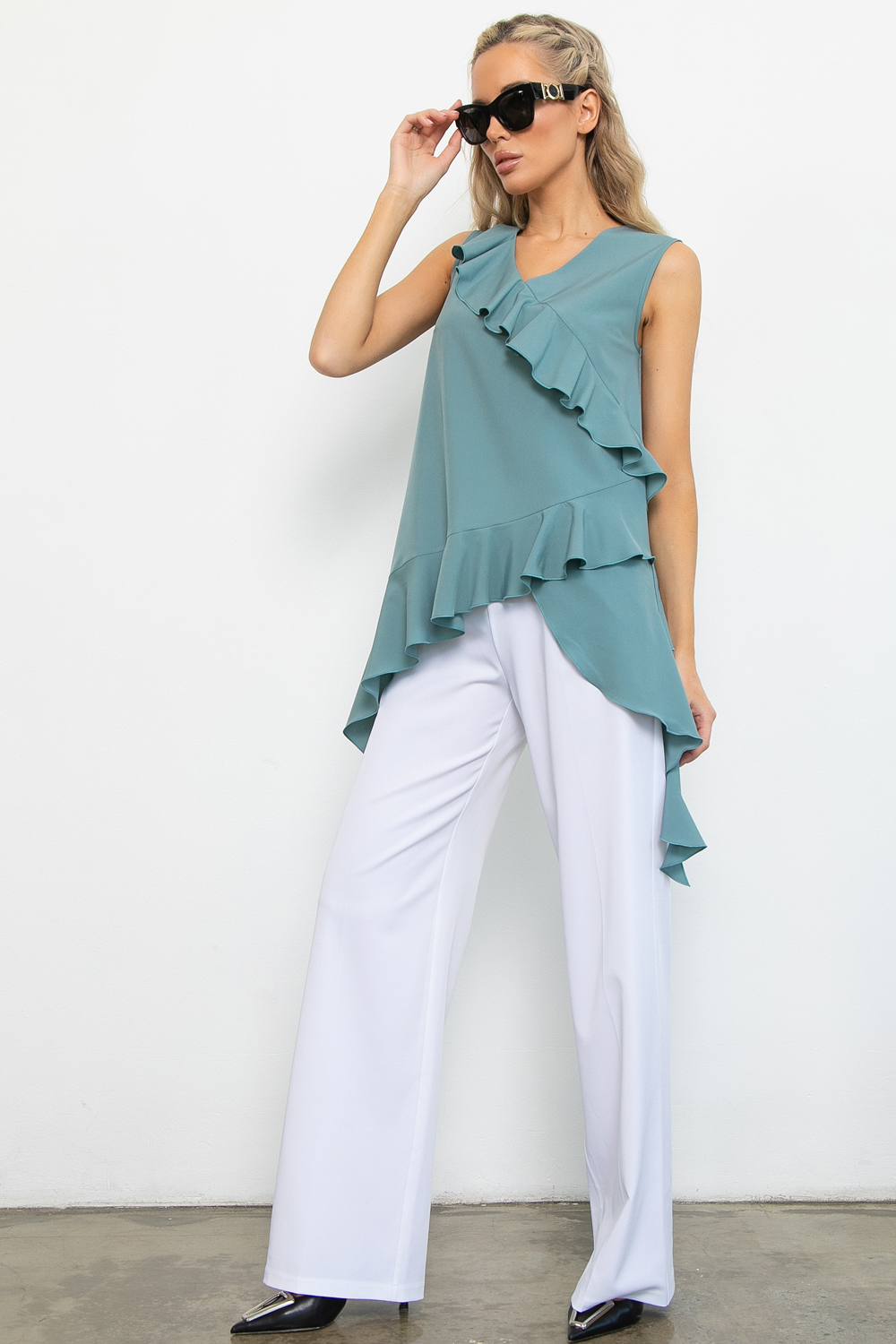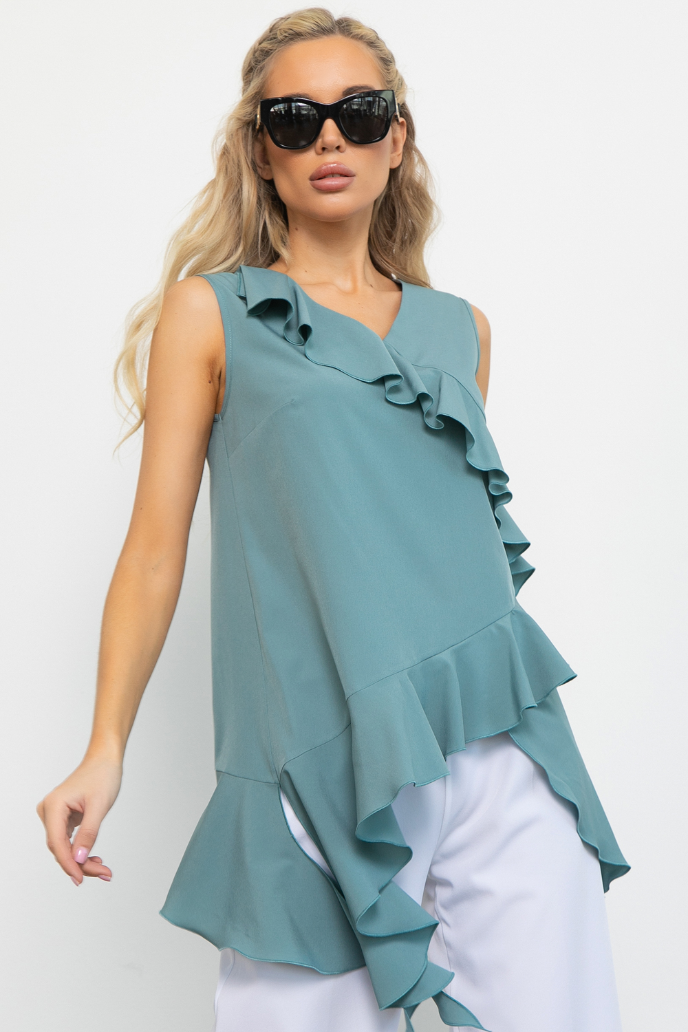 Туника с длинными воланами – это элегантный и универсальный предмет гардероба, который подчеркнет вашу женственность и добавит образу легкости и романтичности. Выполнена из легкой и приятной к телу ткани, обеспечивающей комфорт в течение всего дня. Благодаря своему лаконичному дизайну, эта туника подойдёт как для офиса, так и  для вечерних прогулок. Надевайте ее с аксессуарами или обувью на каблуках, чтобы создать более формальный вид, или сочетайте с кроссовками для повседневного образа.