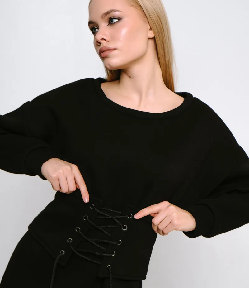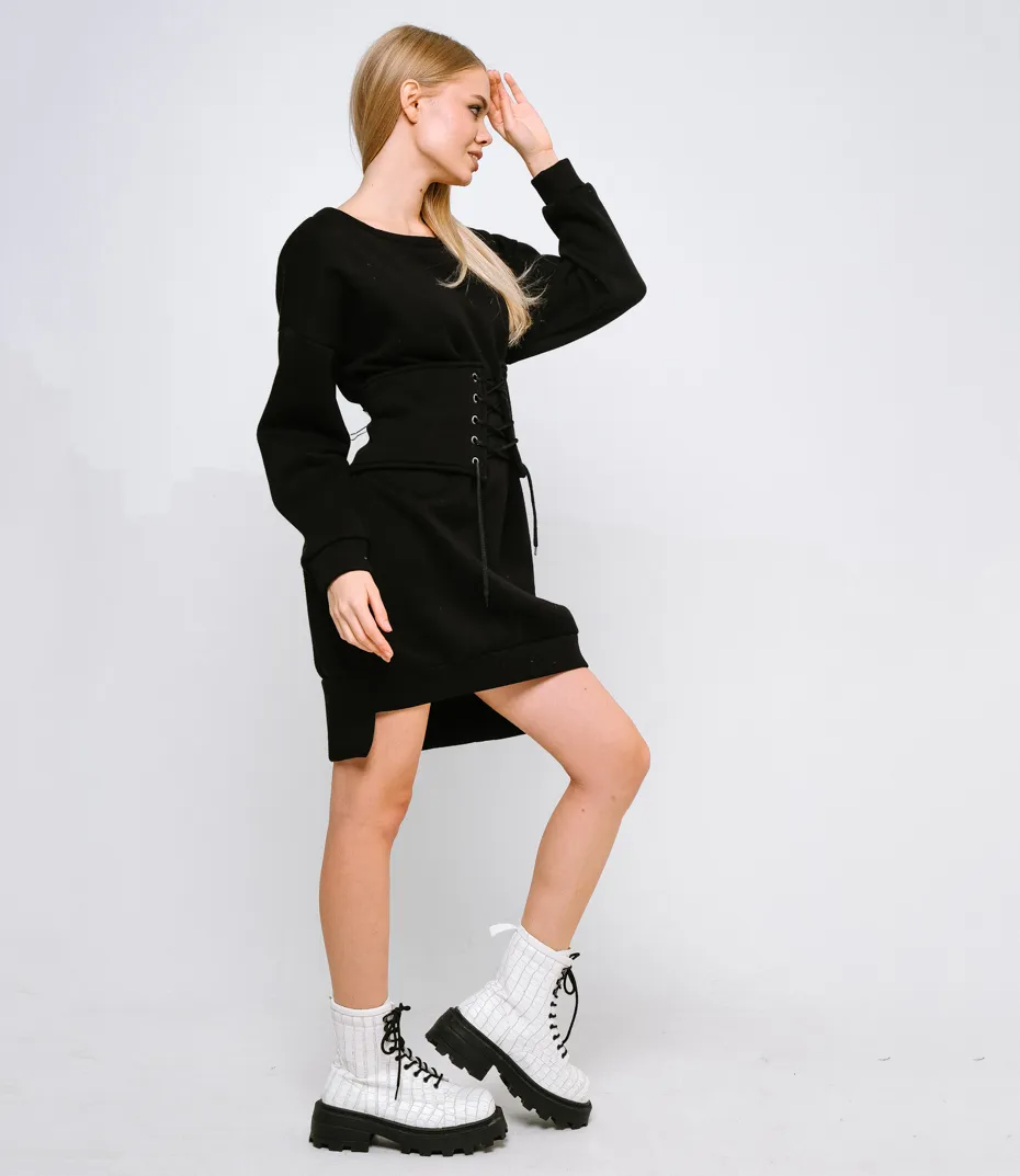 Стильное теплое платье благодаря модной длине идеально подходит для повседневного образа в прохладный сезон. Модель дополнена корсетом, который подчеркивает талию и придает образу красивый силуэт и женственность.