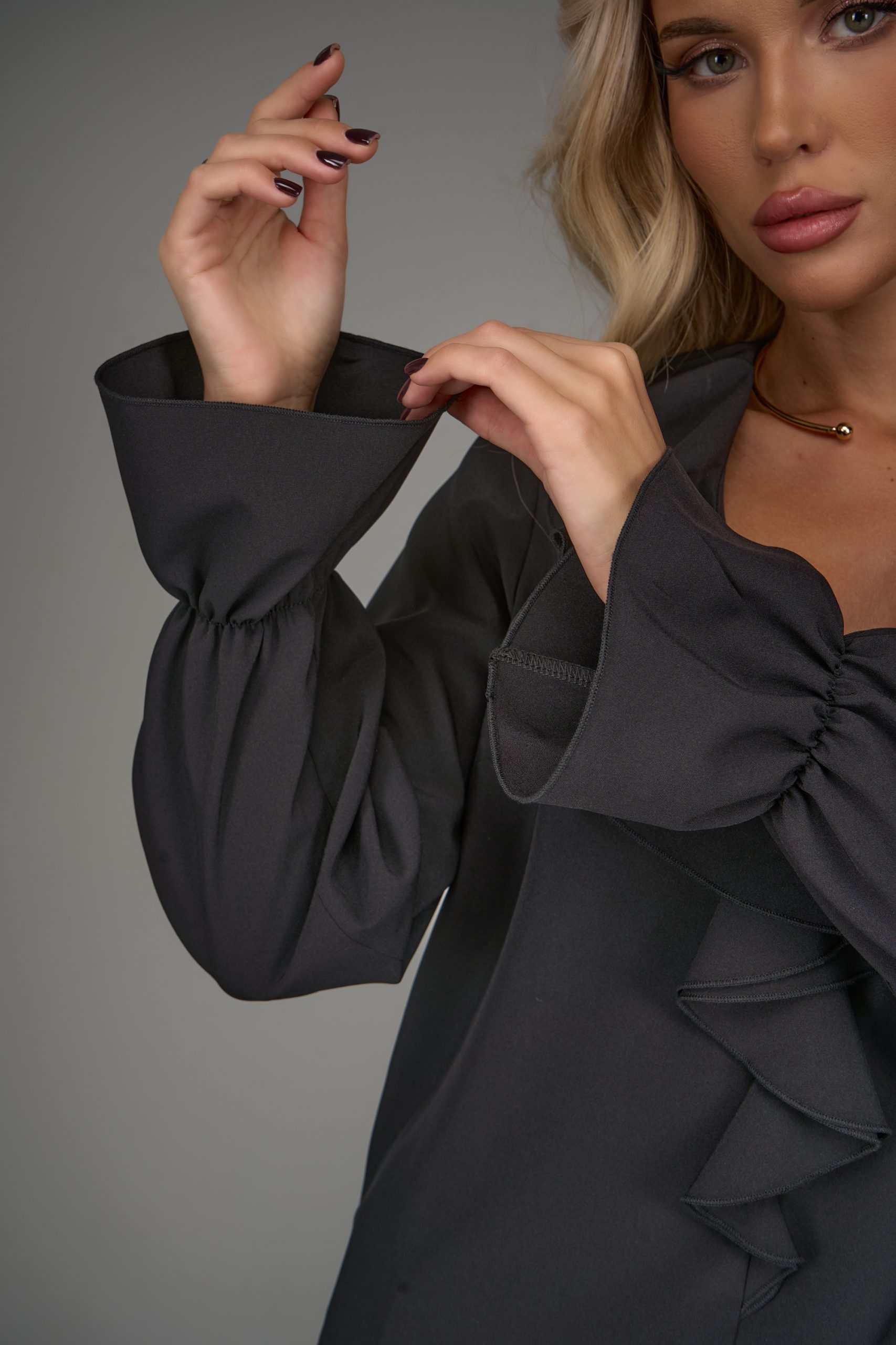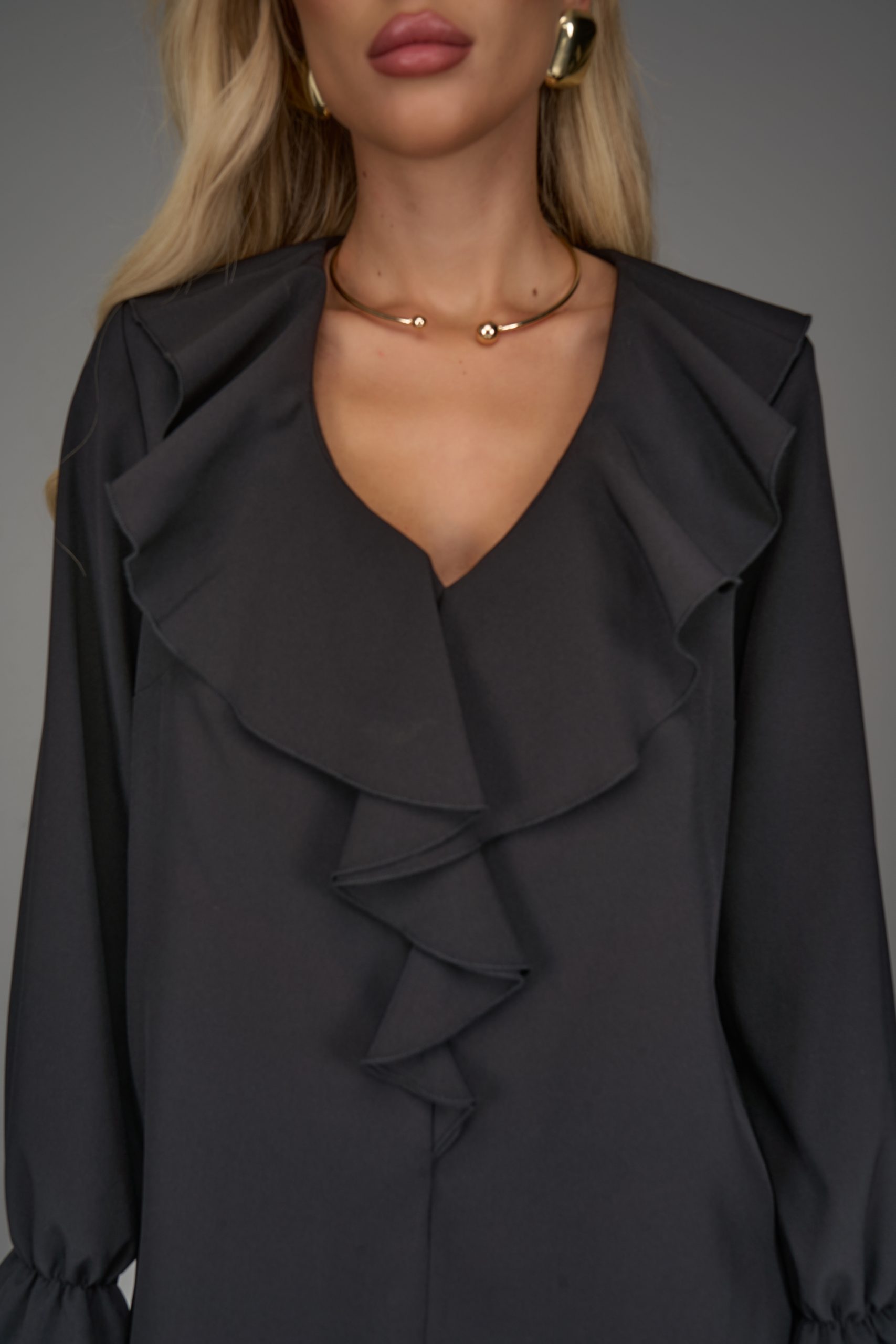 Воротник выполнен из двух слоёв ткани, имеет округлую форму с удлинёнными концами, создающими визуальную вертикаль и вытягивающими силуэт. Центральный волан мягко спадает вниз, формируя выразительный, но не перегруженный акцент.