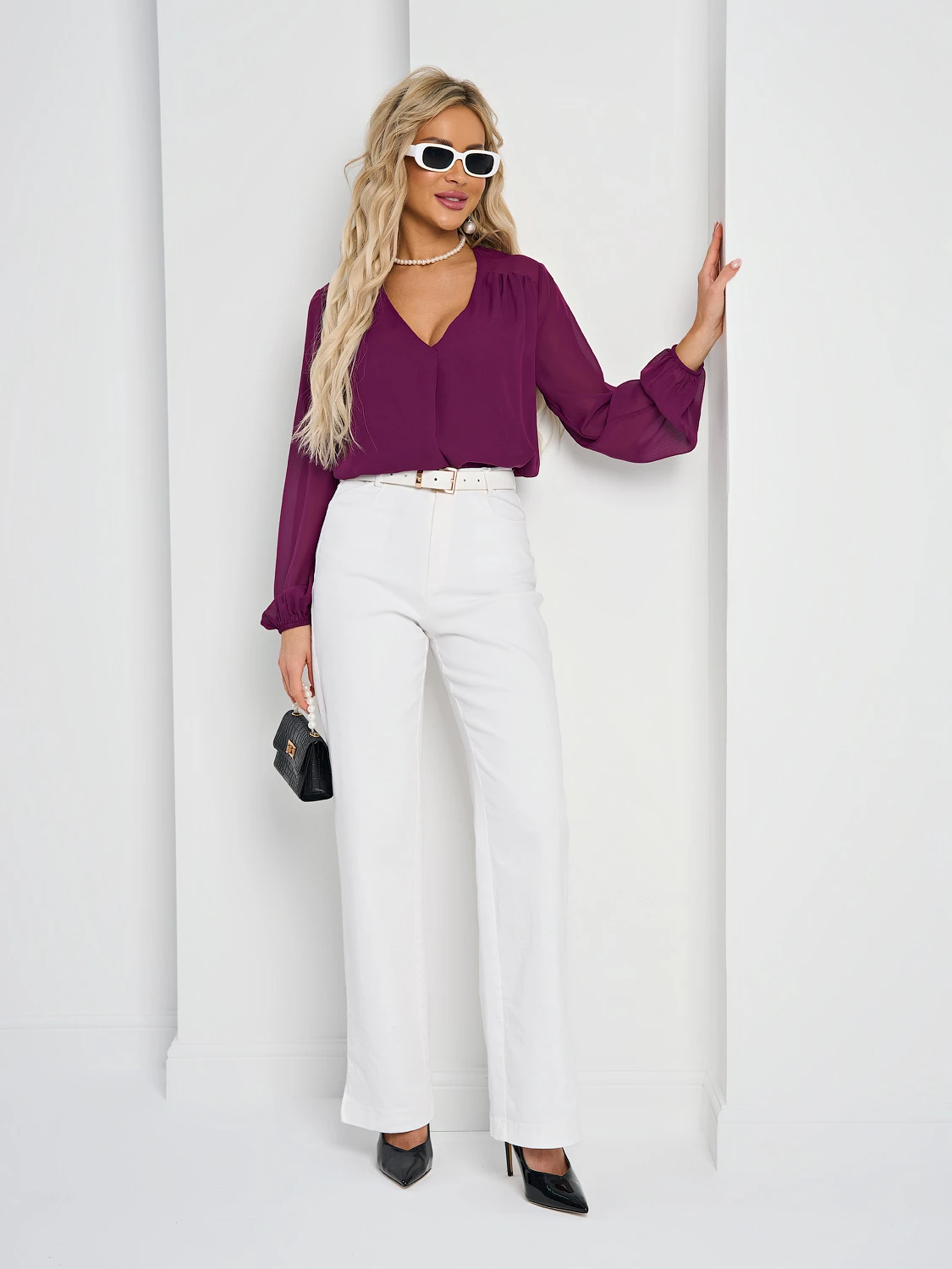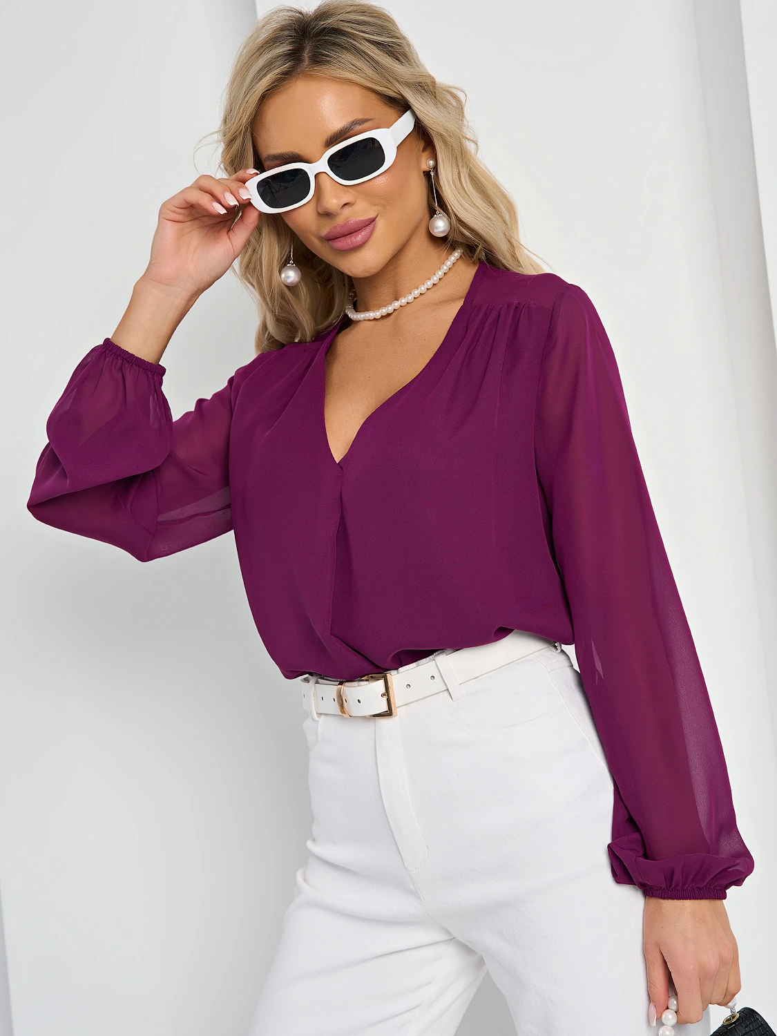 Блуза прямого кроя с V-образным вырезом.