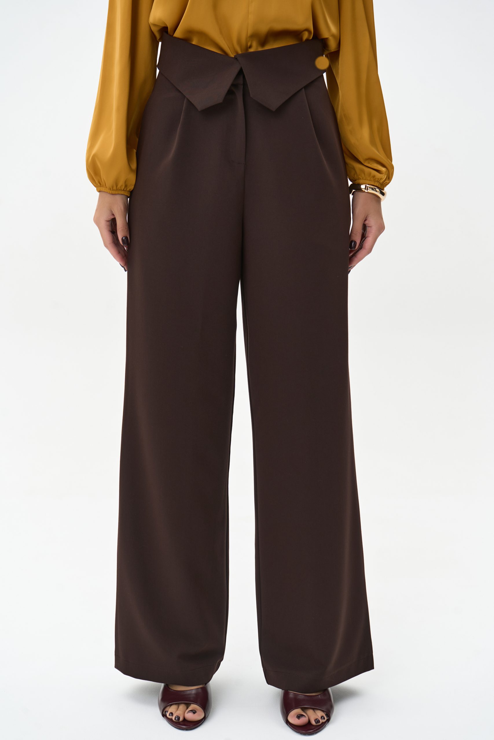 Брюки — прямого свободного кроя с завышенной посадкой. Идеально садятся по фигуре и создают изящную вертикаль, визуально удлиняя ноги.