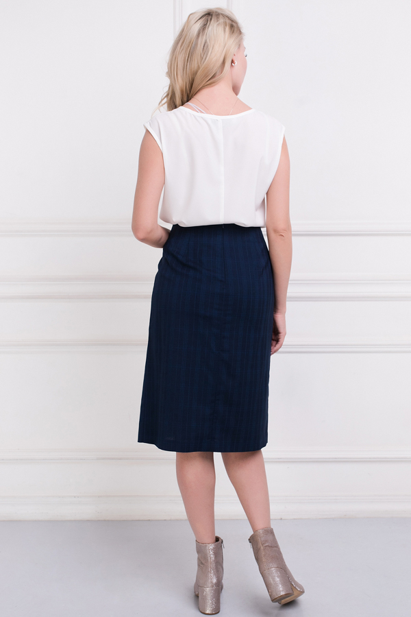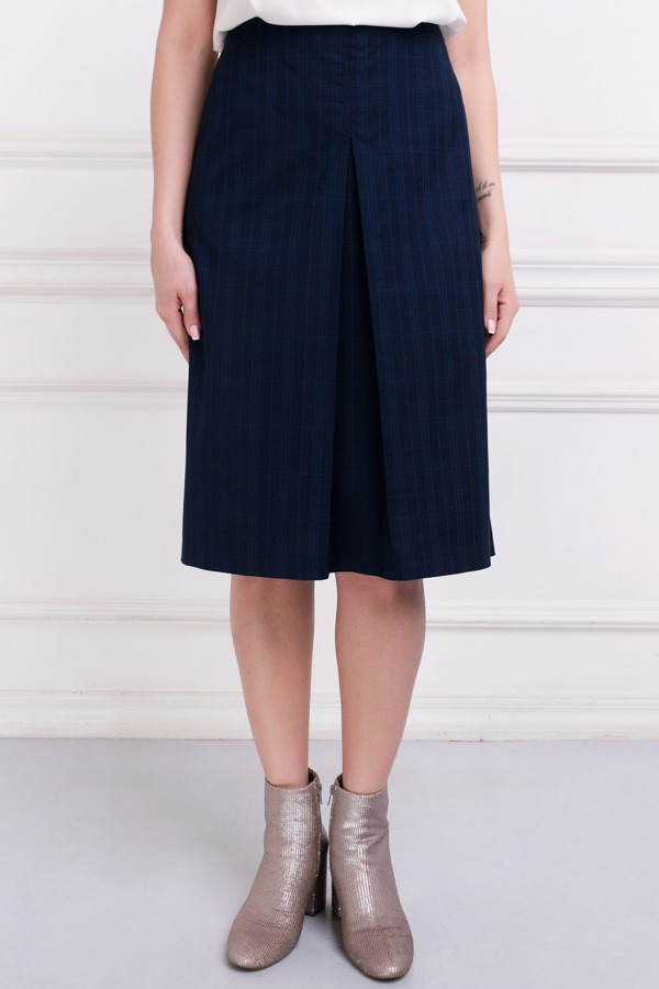 Юбка из костюмной ткани, расширенная книзу. Сзади по среднему шву выполнена застёжка-молния. Изделие без пояса, верхний срез обработан обтачкой. По центру передней части изделия выполнена встречная складка.