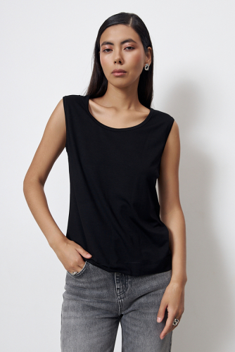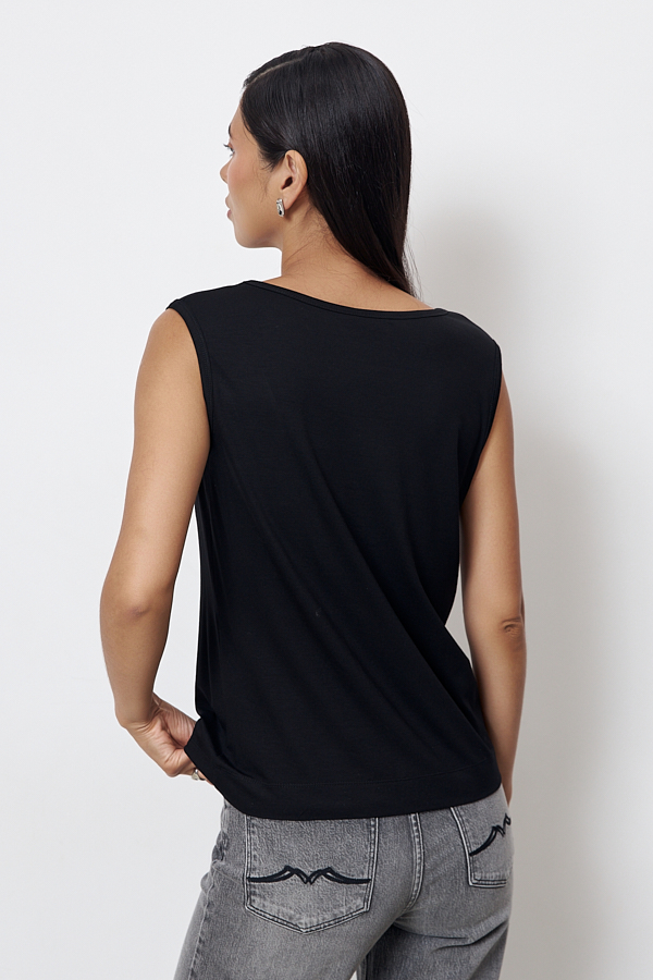 Топ из эластичного полотна полуприлегающего силуэта. Линия горловины и линия проймы окантованы эластичной бейкой.
