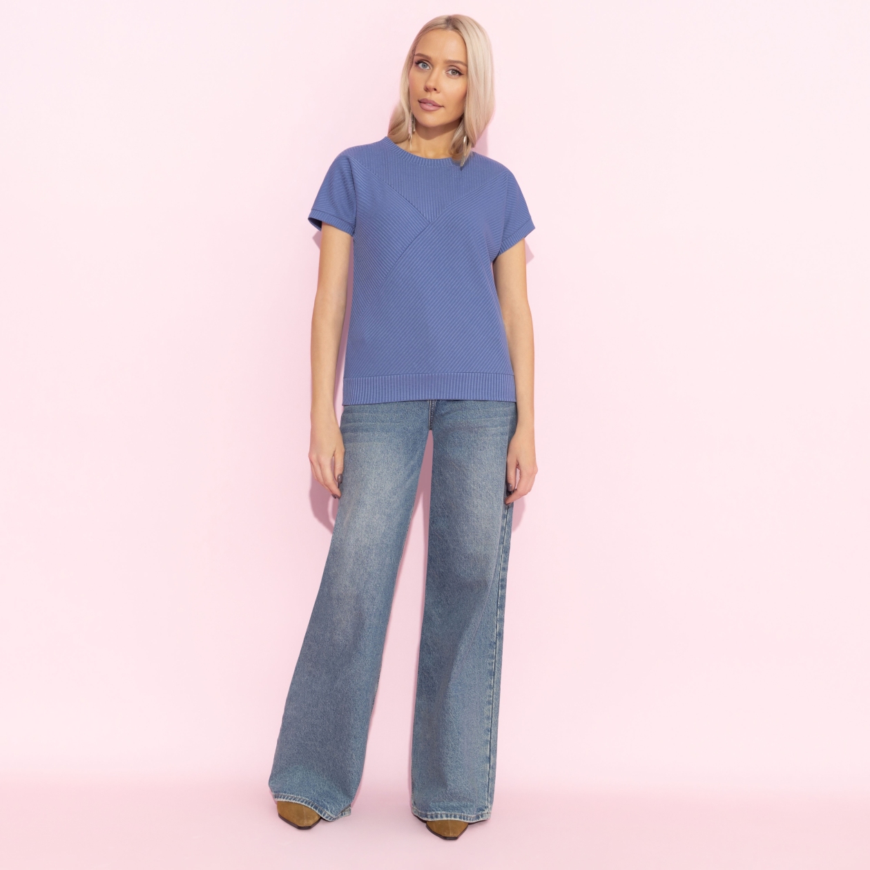 Вибрации утра беспощадны. Врожденный перфекционизм каждый день поднимает тебя ни свет ни заря и вынуждает наводить красоту. CHARUTTI экономит несколько драгоценных минут – футболка в цвете голубики всегда выглядит роскошно. Футболка свободной посадки прямого силуэта. Материал изделия фактурный. Линия плеча спущена. Футболка хорошо смотрится в заправленном виде и навыпуск.