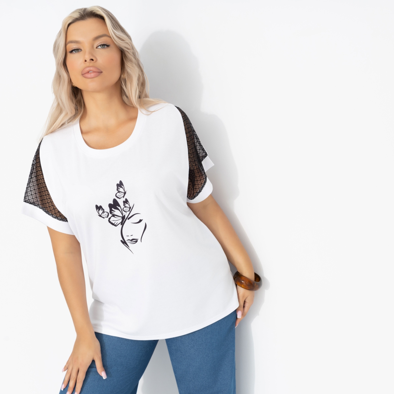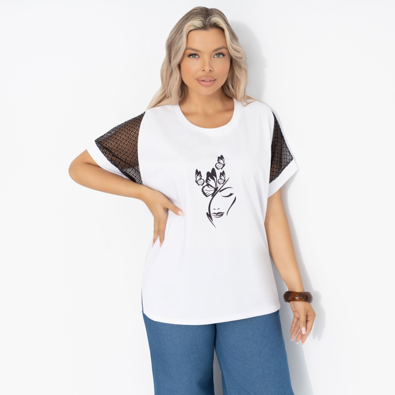 Современная супервумэн не носит плащ, она носит футболку ЧАРУТТИ. Комфортная и стильная, она подходит для ежедневных подвигов – работы, заботы о детях, ухода за домом и помощи маме. Футболка свободного кроя, комбинированная. Изделие хорошо смотрится в заправленной виде и навыпуск.