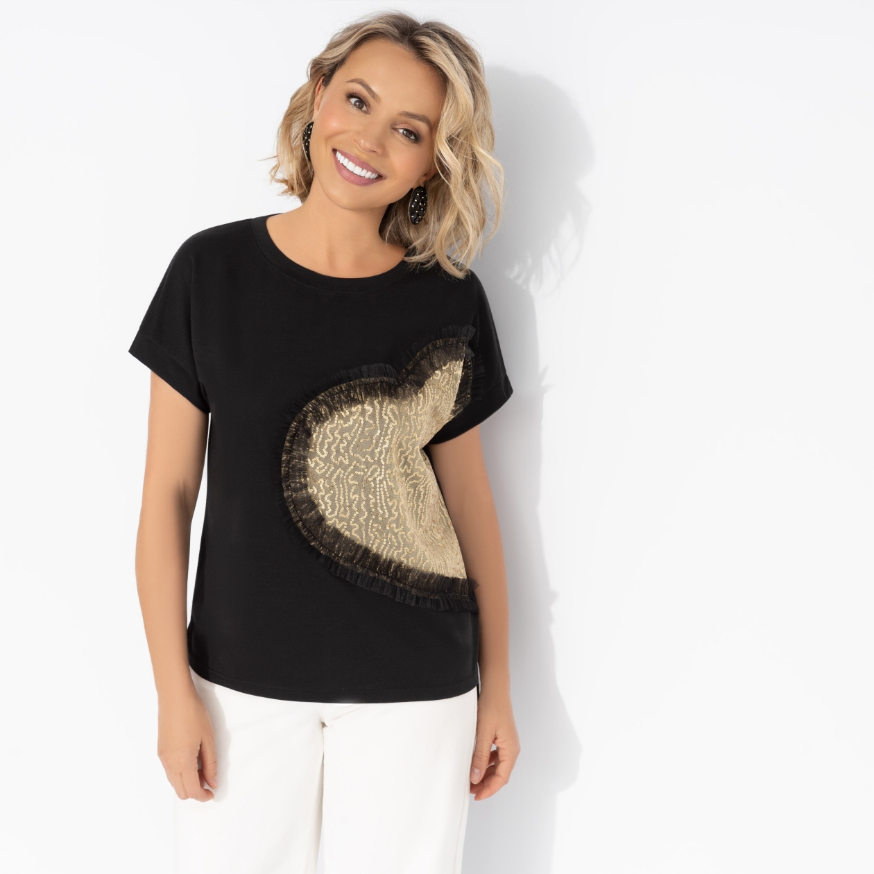 Футболка супер! Очень красивая. Трикотаж плотный, гладкий, тяжелый. Сердце из благородных золотых паеток. Все прошито идеально. Идет в размер. Брала на размер 46 рост 160. Все село как надо. Крой прямой, все недостатки талии скрыты). Спинка идет чуть длиннее переда. Маленькие разрезики по бокам. Рекомендую!!!
