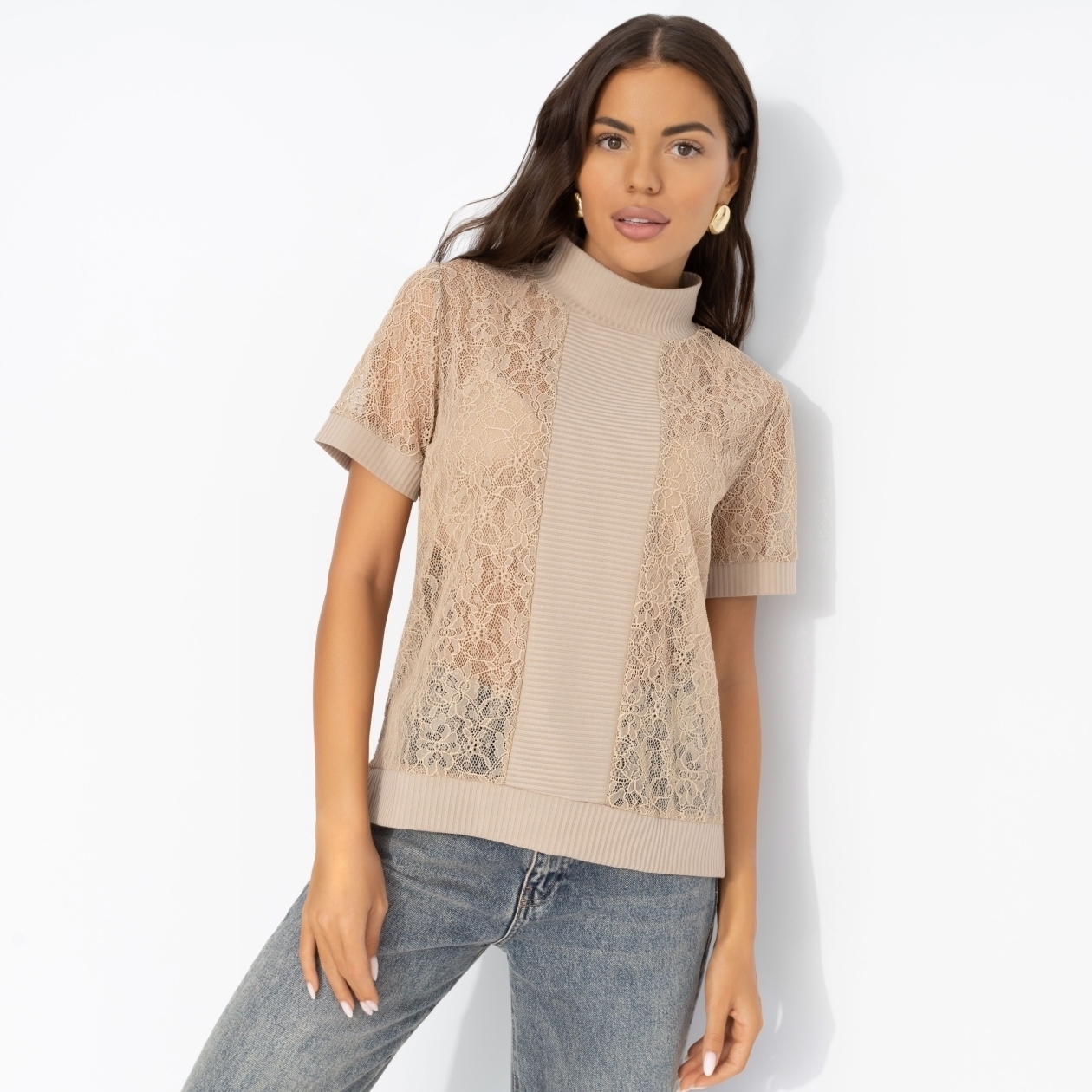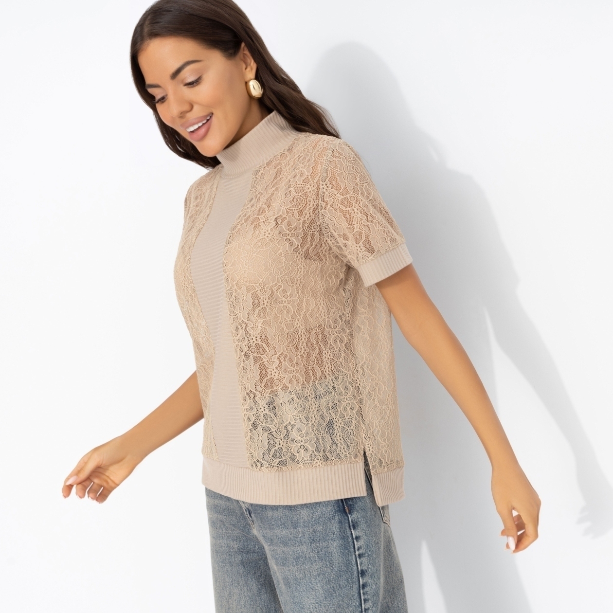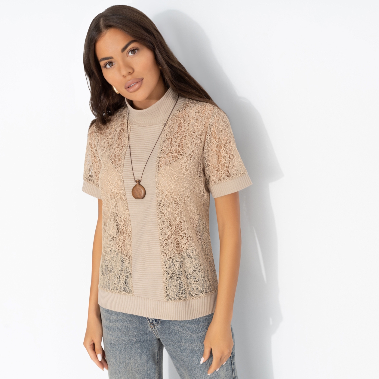 Она надела футболку ЧАРУТТИ цвета капучино на встречу с подругами – нежное кружево тут же стало главной темой вечера. Каждая из девушек узнала в узоре что-то своё: Настя – итальянское кафе, Лиза – бабушкин винтажный сервиз, а Катя просто потрогала ткань и вздохнула: «Мне бы такую же, но с карамельным сиропом». Футболка классического силуэта с высоким воротом. Часть изделия из кружева. Футболка слегка просвечивает.