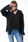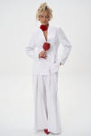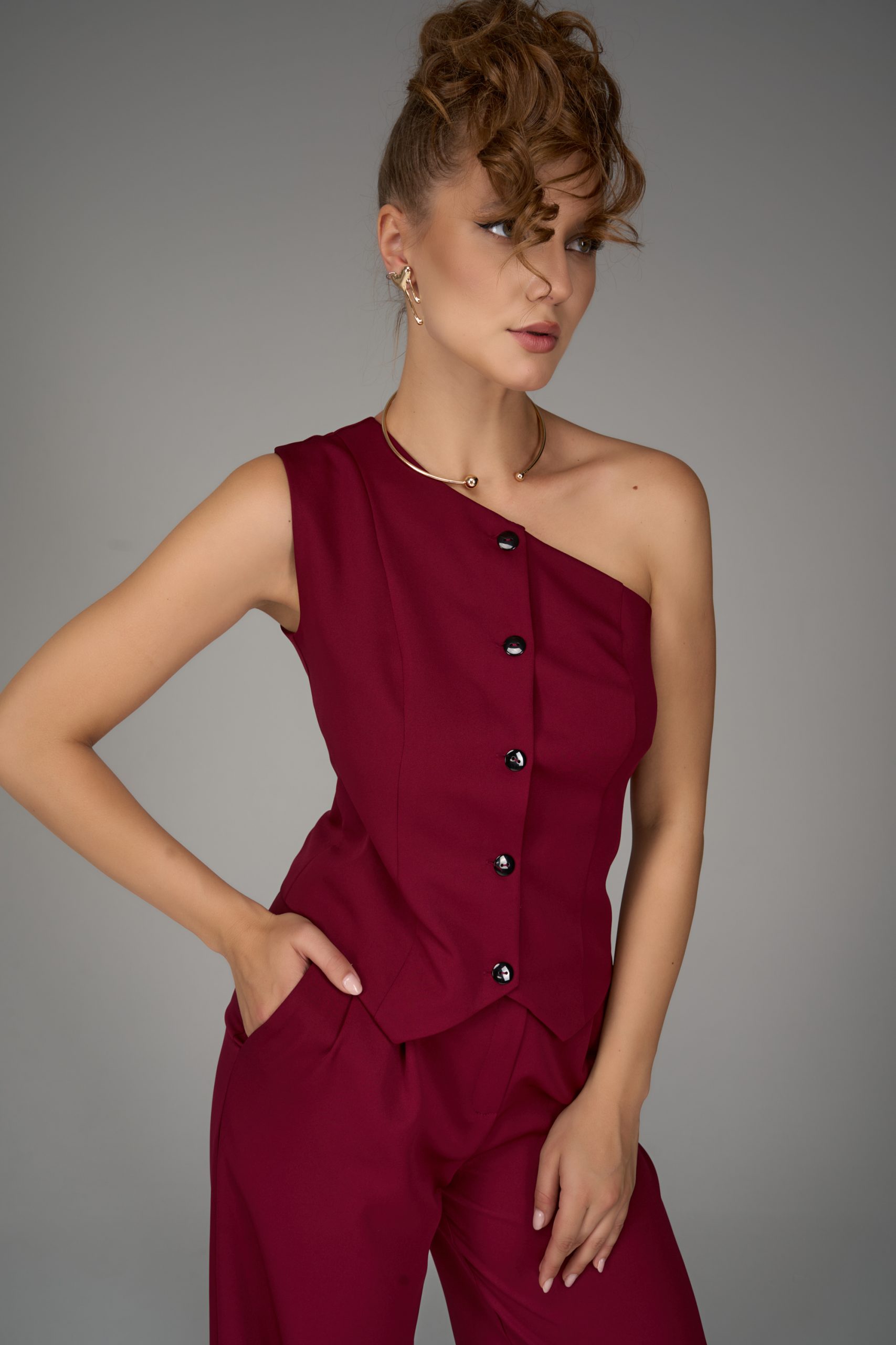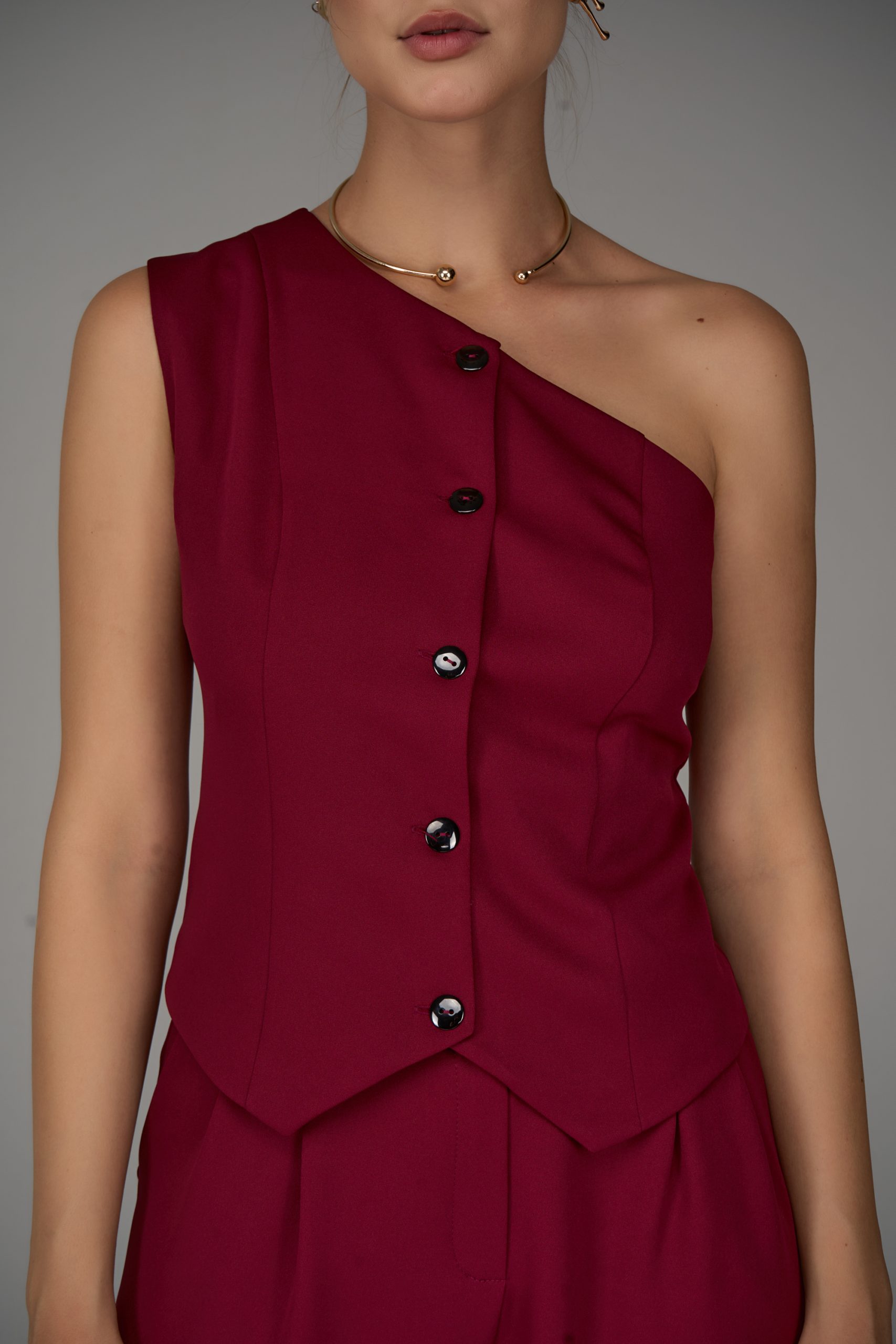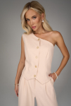Жилет на одно плечо — смелый акцент коллекции. Нестандартный крой превращает классическую деталь гардероба в модное высказывание. Ассиметричная линия делает образ современным и запоминающимся, подчеркивая изящность фигуры и утончённый вкус.