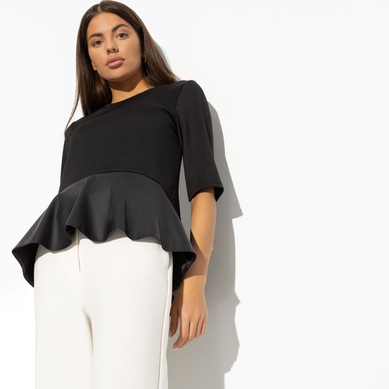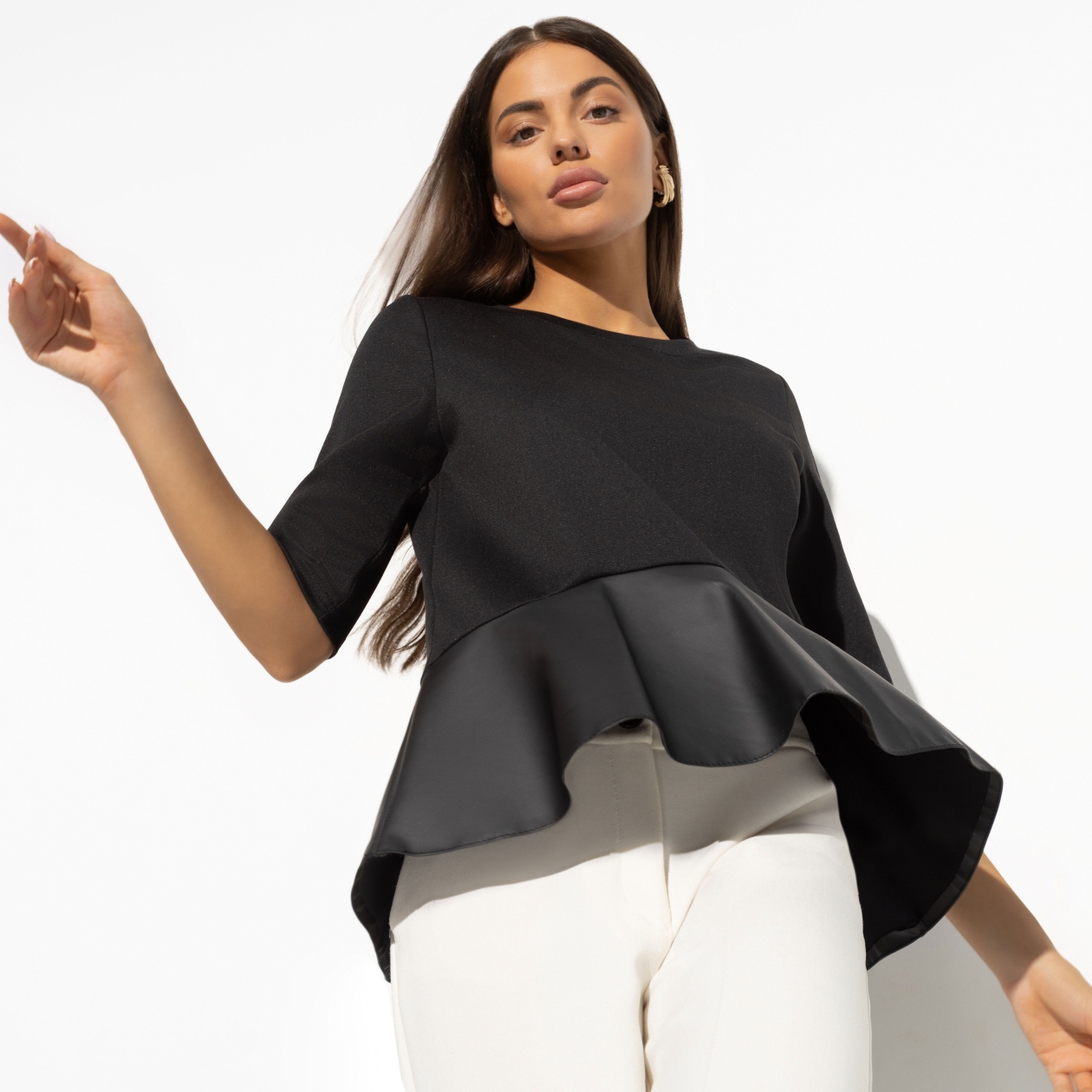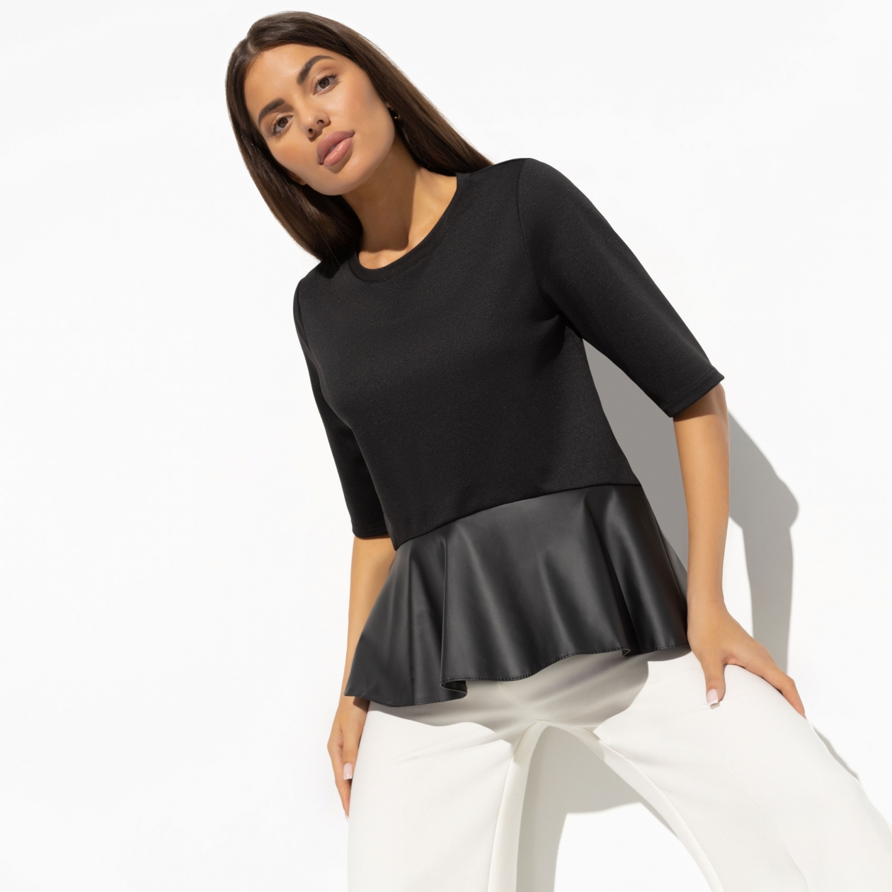 Эта блуза идеально подходит для создания актуальных и трендовых образов, что делает её привлекательным предложением для оптовых покупателей. Она создана для женщин, которые хотят идти в ногу с модой, но при этом ценят комфорт и универсальность. Свободная посадка и баска из экокожи создают эффектный силуэт, который привлекает внимание и подчёркивает достоинства фигуры.