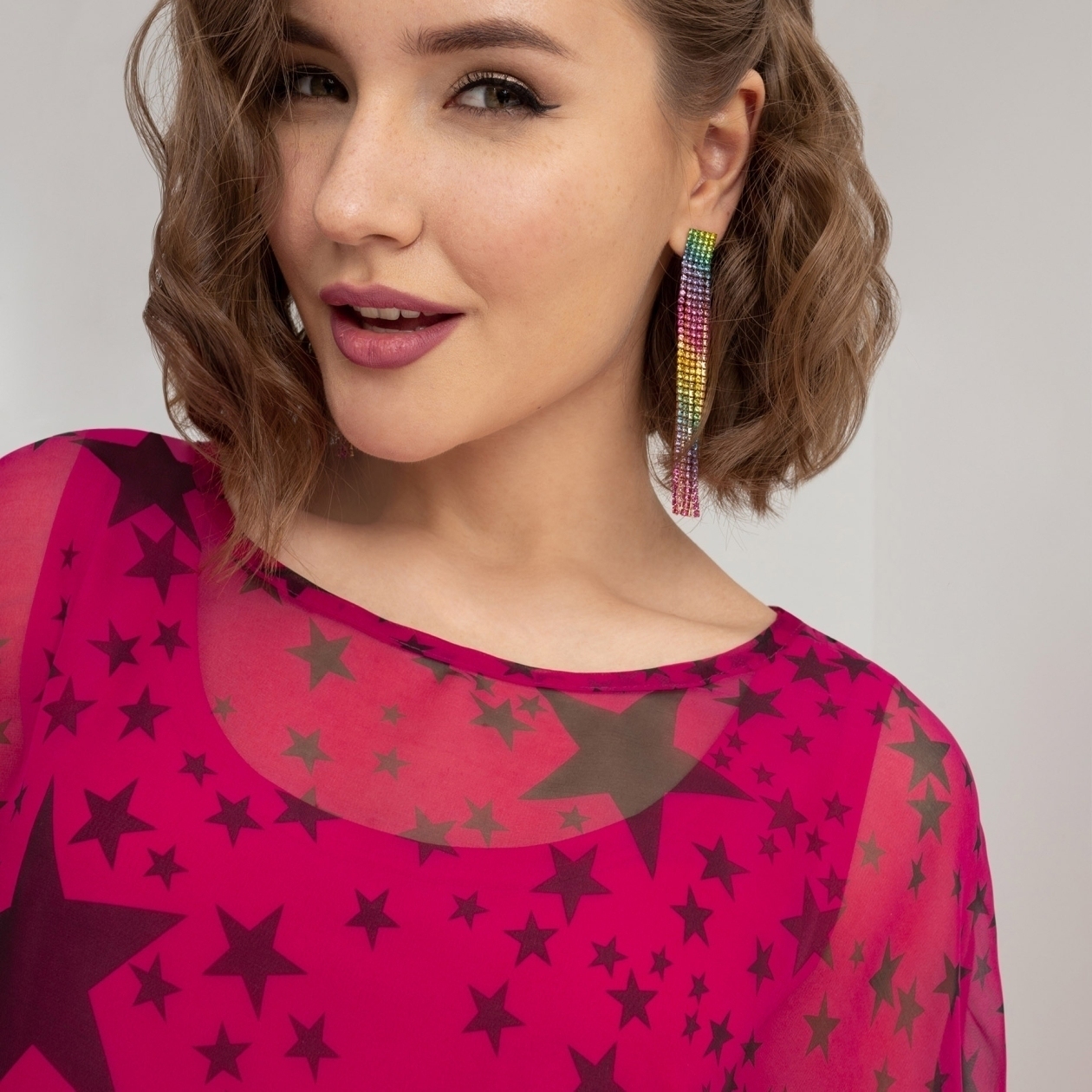 Жар софитов ощущается в воздухе. Все взгляды прикованы к вам. Ваш выход: полупрозрачная туника в цвете фуксия, усыпанная звездными принтами. «Летящая» линия рукава. Выглядите космически круто! Топ в комплекте.