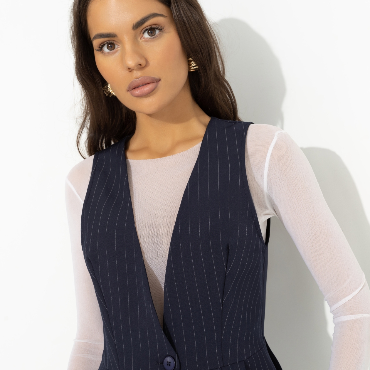 Этот жилет женский больших размеров подойдет дамам с любыми параметрами, подчеркивая достоинства фигуры благодаря приталенному силуэту и изысканной баске на подоле. Это изделие без лацканов, что придает ему современный и лаконичный вид, идеально подходящий для создания стильных образов. Уникальная застежка на одну пуговицу добавляет жилету шарма и делает его универсальным выбором как для деловых встреч, так и для вечерних выходов. Оптом приобретение этого жилета позволит вам предложить своим клиентам роскошь по доступной цене, создавая уникальные предложения в вашем магазине.