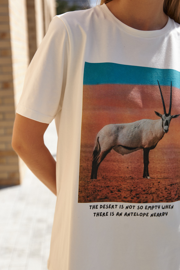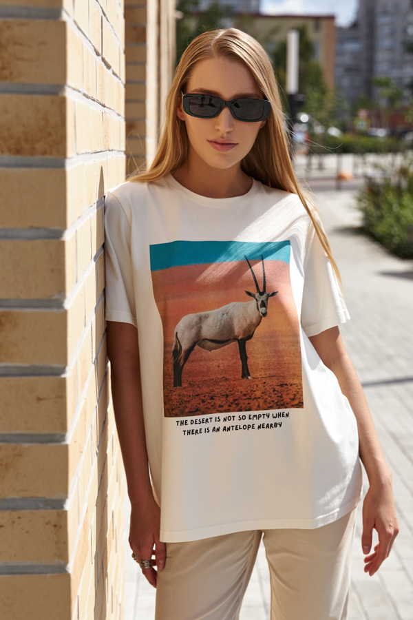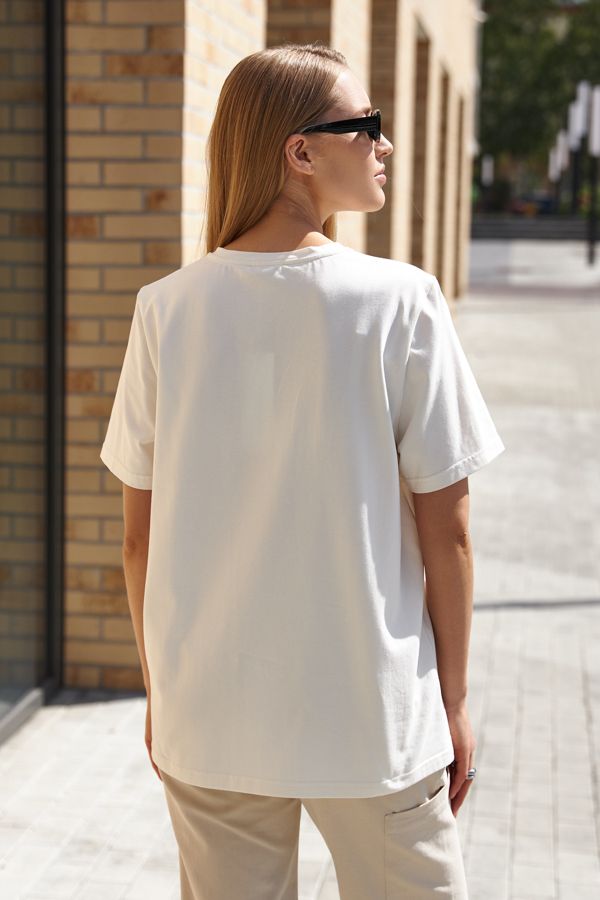 Джемпер свободного силуэта из хлопкового эластичного полотна. Втачной короткий рукав. Круглый вырез горловины оформлен бейкой. На передней части изделия нанесён принт методом шелкографии.
