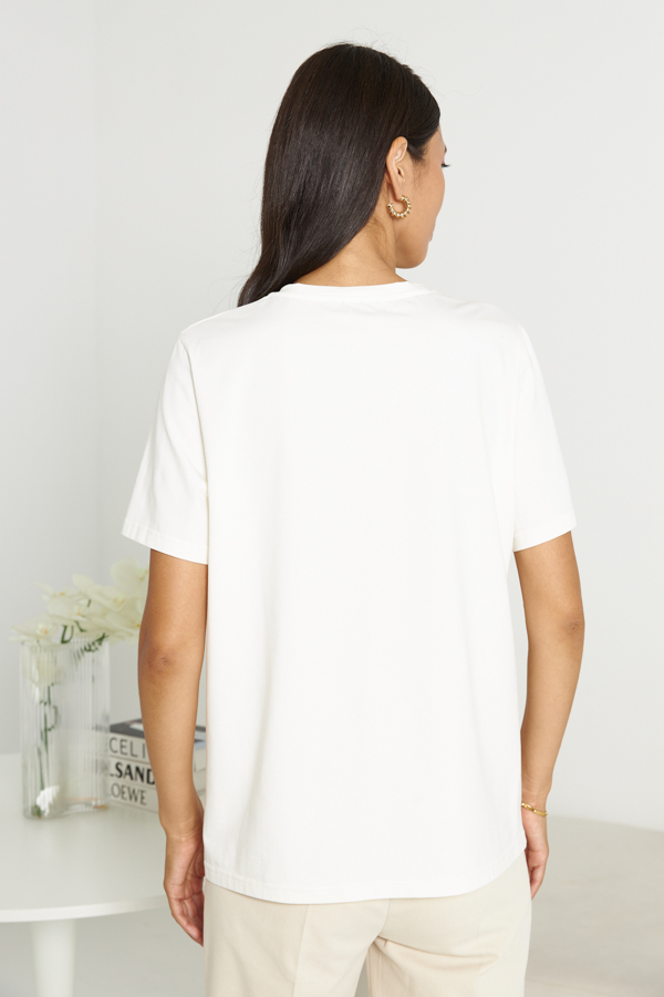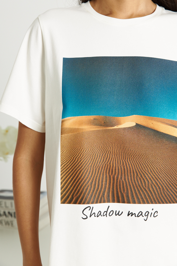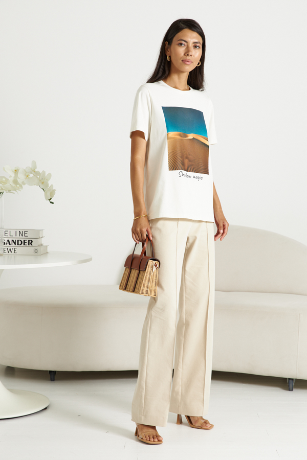 Джемпер свободного силуэта из хлопкового эластичного полотна. Втачной короткий рукав. Круглый вырез горловины оформлен бейкой. На передней части изделия нанесён принт методом шелкографии.
