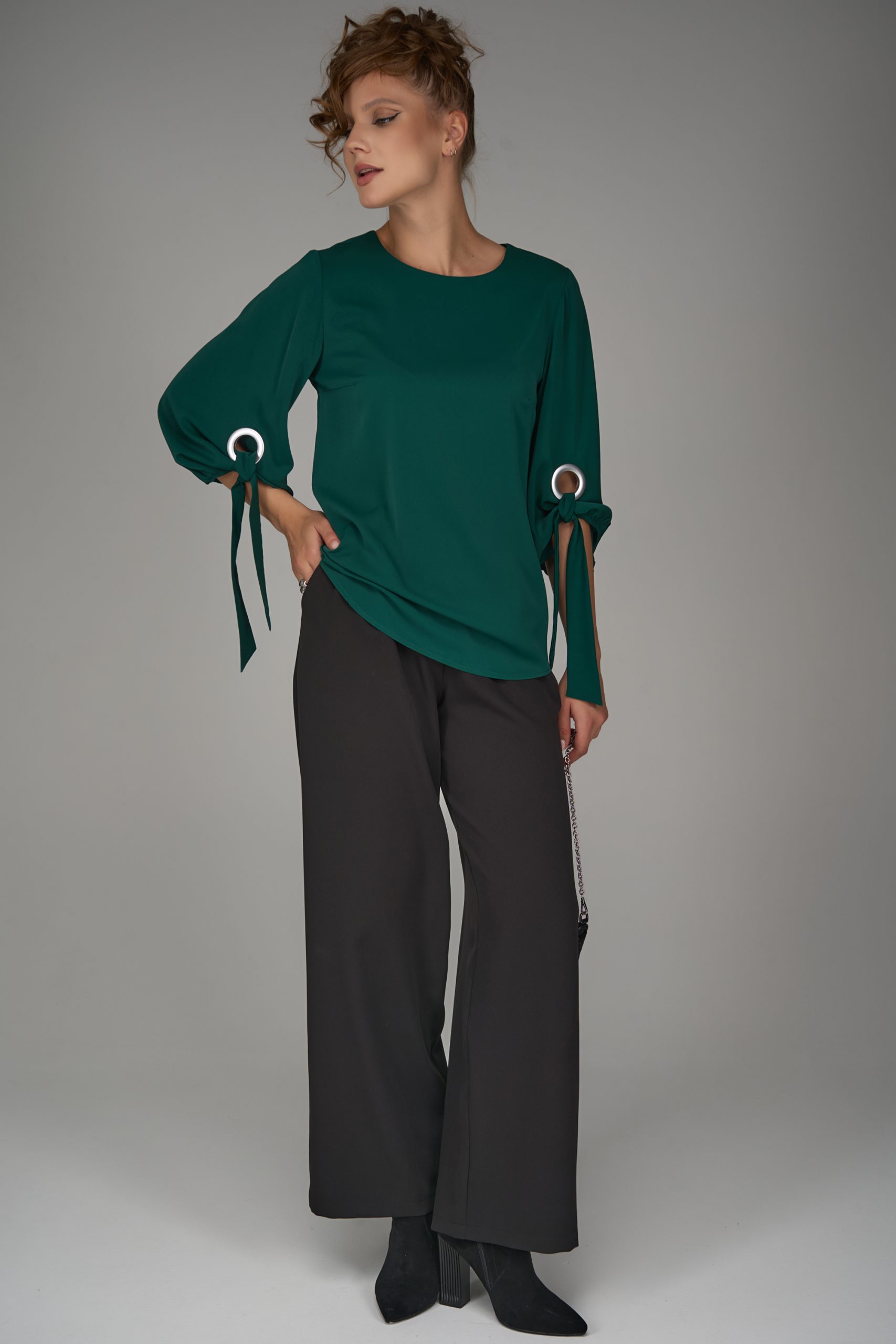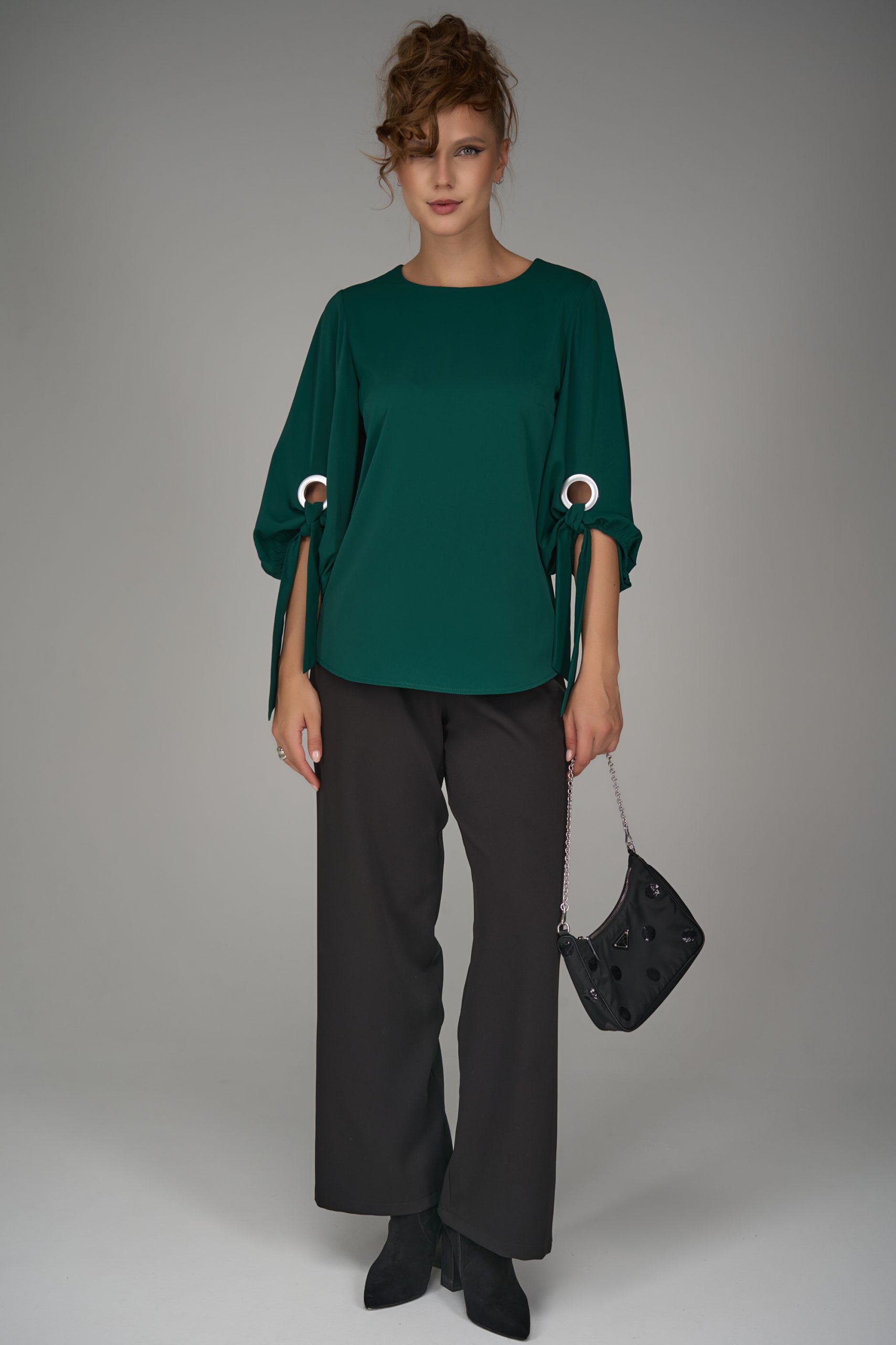Элегантная блузка глубокого изумрудного оттенка создана для тех, кто ценит стиль и комфорт. Лаконичный прямой крой идеально сочетается с эффектными рукавами ¾, украшенными декоративными завязками и металлическим кольцом.