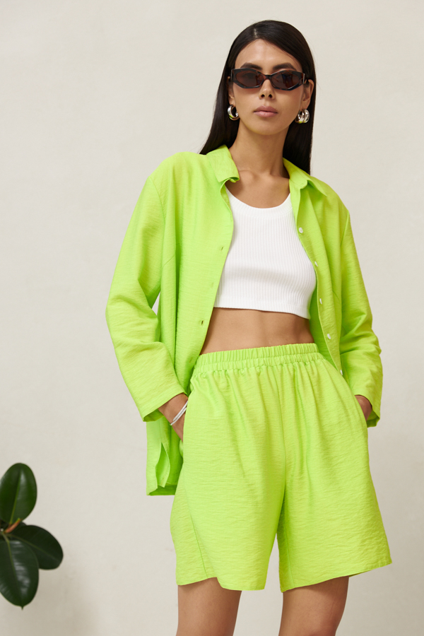 Шорты свободного силуэта из вискозной ткани с крэш-эффектом. Пояс притачной с эластичной резиной, в боковых швах карманы.