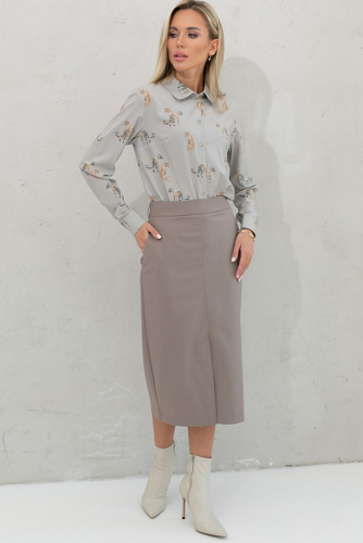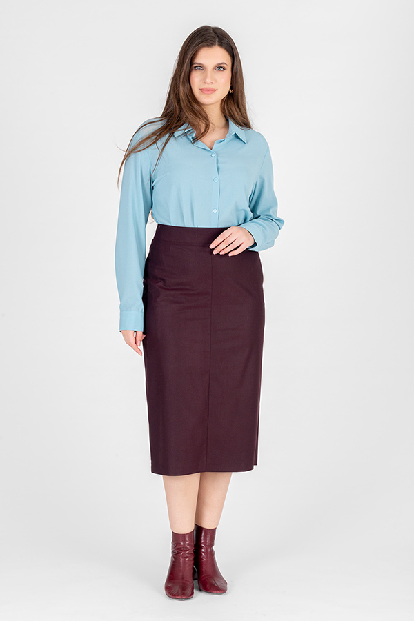 Юбка прилегающего силуэта из костюмной ткани. По центру передней части изделия выполнен шов. Сзади по среднему шву застёжка-молния, снизу разрез. Пояс притачной.