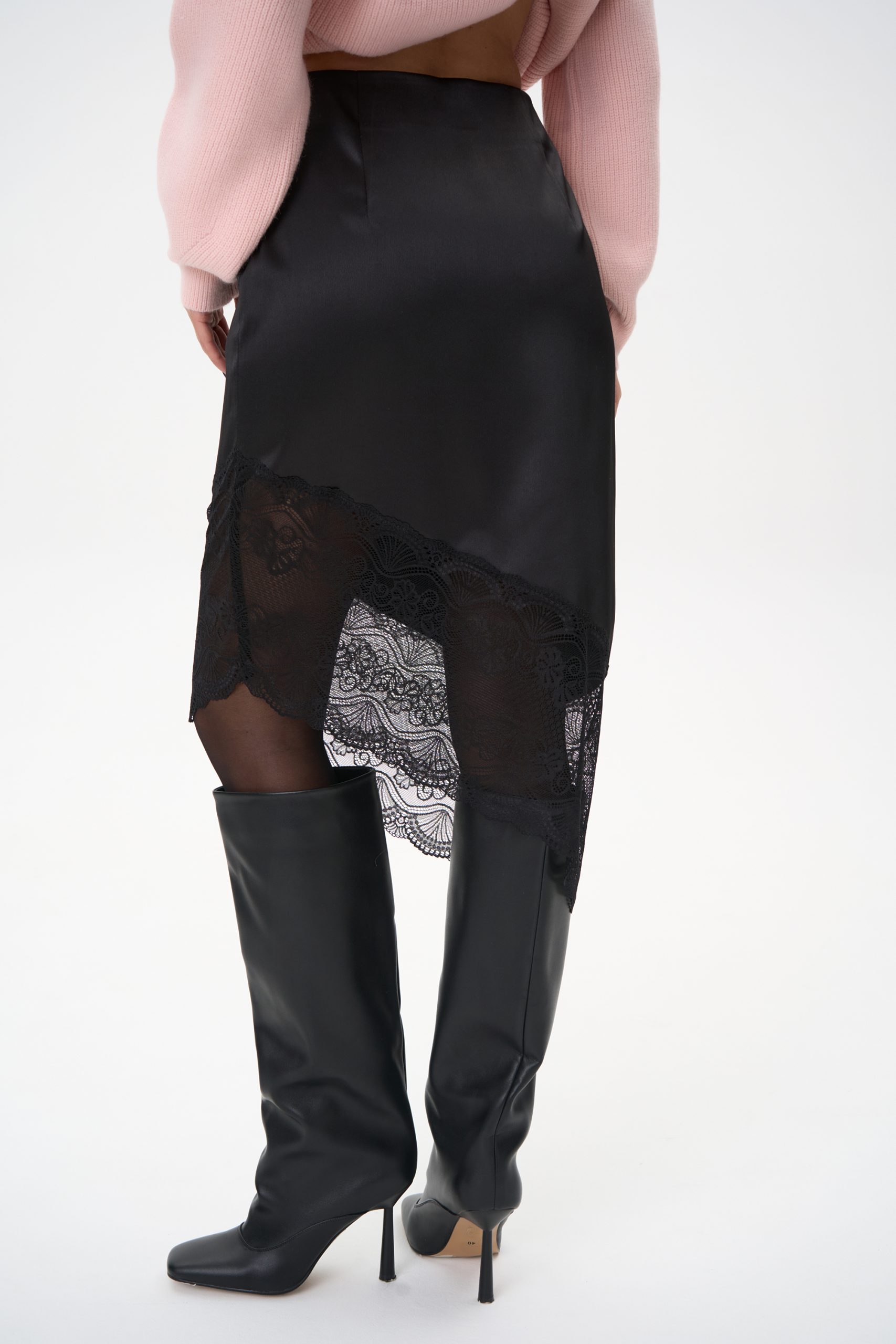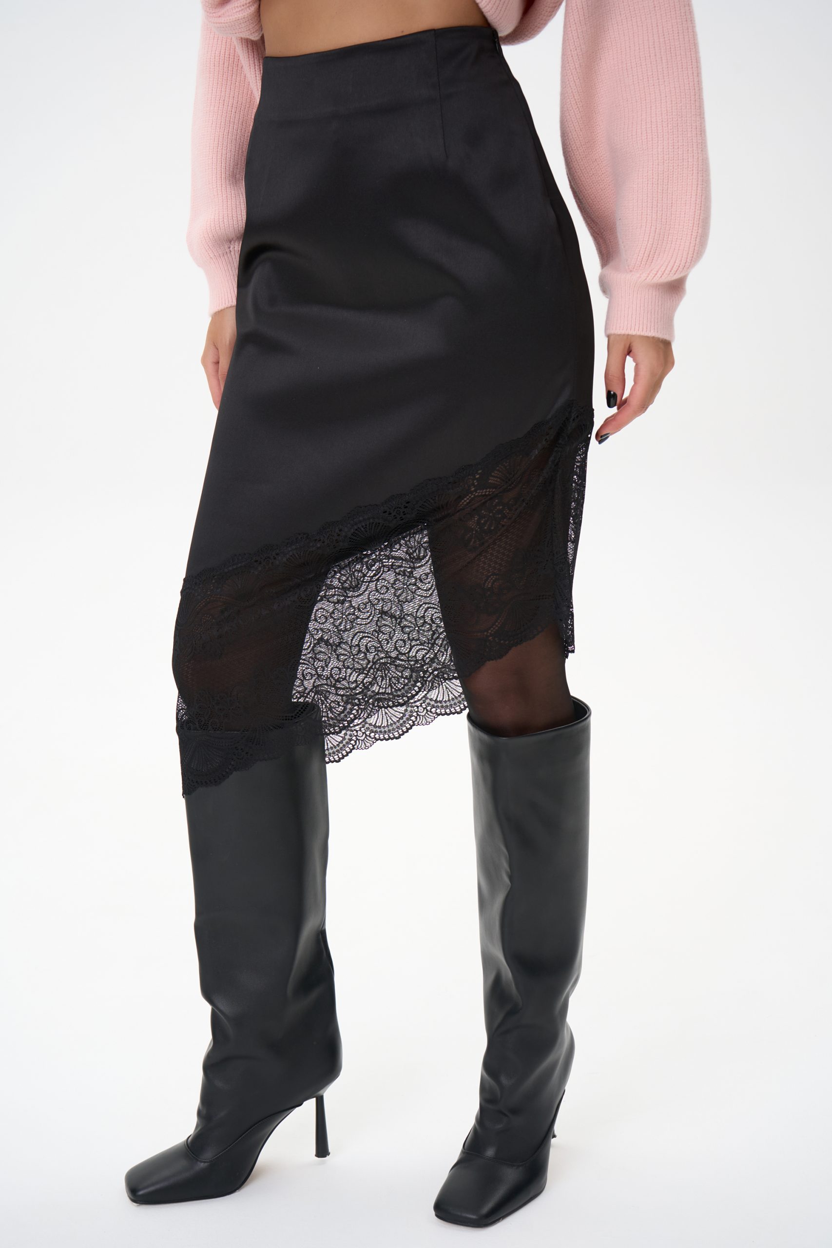 Юбка с асимметричной линией низа и акцентной кружевной вставкой. Чистый силуэт, лёгкий блеск ткани и контраст фактур создают современный и утончённый образ. Модель представлена в двух цветах — универсальном чёрном и светлом оттенке, подчеркивающем фактуру кружева.