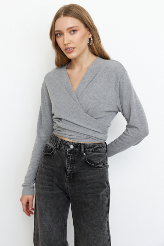 Джемпер полуприлегающего силуэта из меланжевого эластичного полотна. Вырез горловины имеет асимметричную форму. Один рукав втачной, другой-типа реглан.