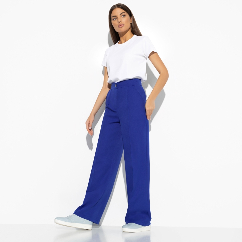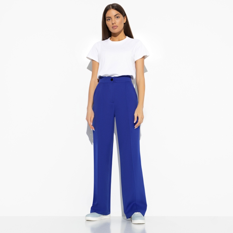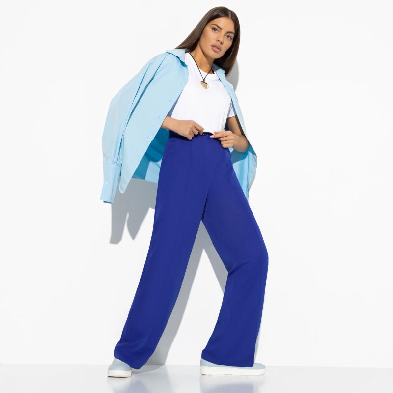 Многие из нас знакомы с ощущением, когда после тяжелого вроде бы трудового дня хочется пойти повеселиться. Есть и силы, и энергия, и компания, и брюки в насыщенном черничном цвете. Получается, что пазл сложился. Брюки свободного кроя с карманами. Пояс на молнии и пуговице. Изделие оформлено выточками по типу стрелок по передней части изделия.