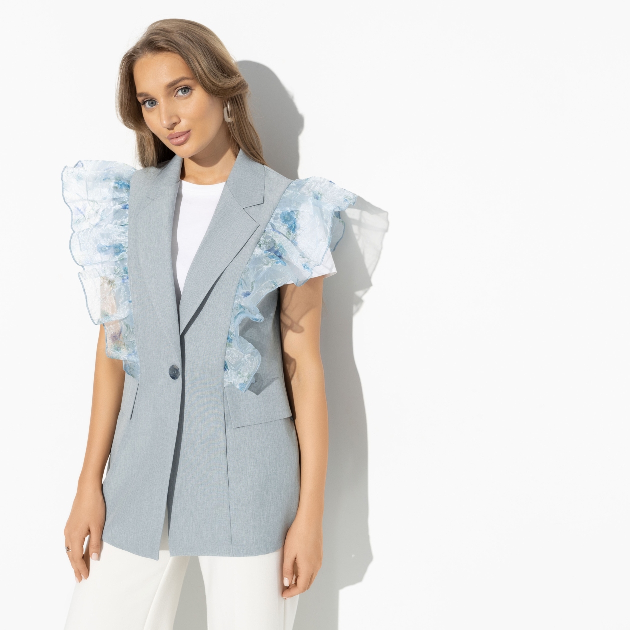 Как в вас сочетается правильное воспитание и желание иногда хулиганить, так и в жилете CHARUTTI сочетаются строгие отглаженные лацканы и объемные заигрывающие рюши. Как? Прекрасно и великолепно!