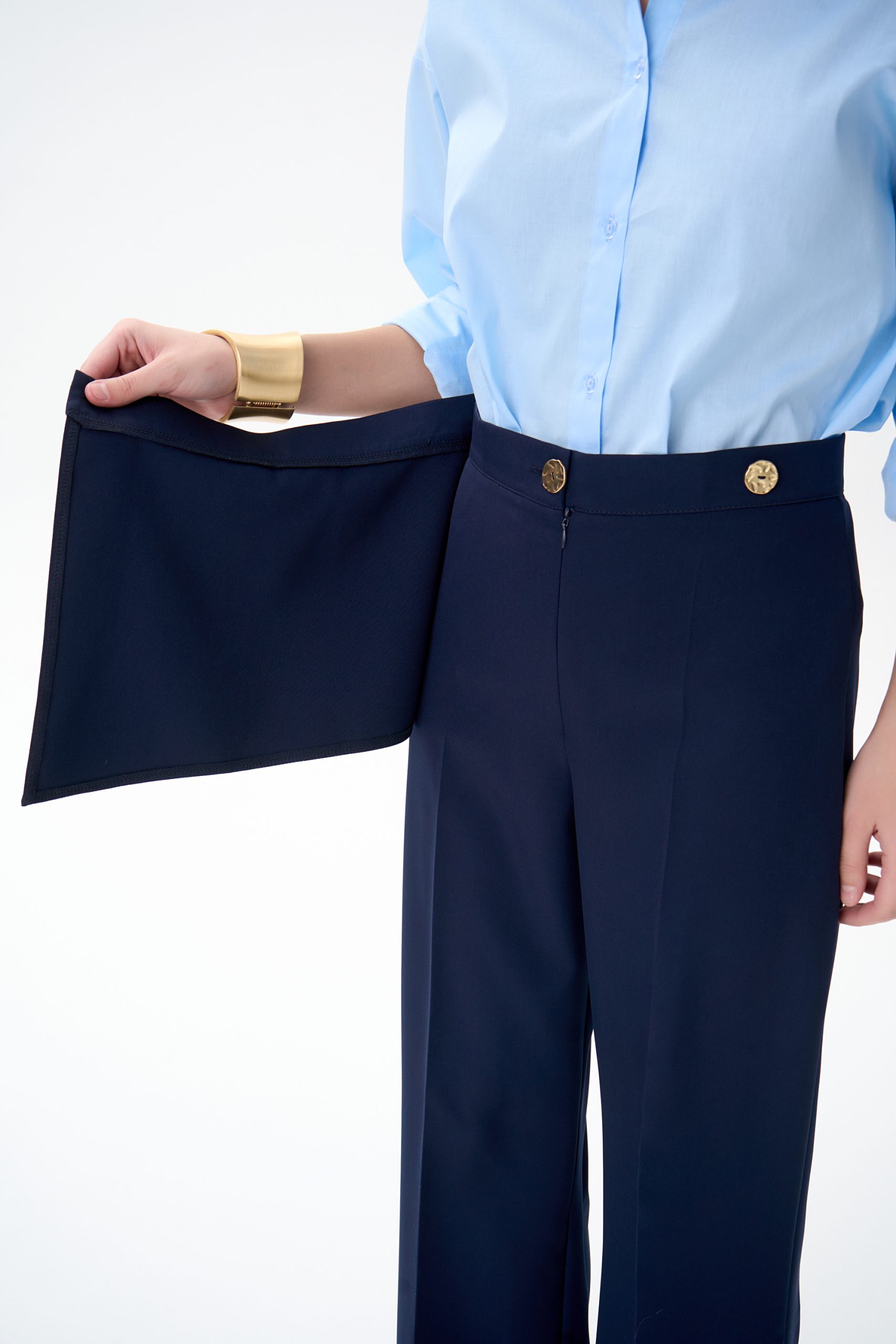 Элегантные брюки прямого силуэта с высокой посадкой и декоративной накидкой спереди. Модель сочетает в себе строгость классических брюк и эффект юбки, создавая выразительный и женственный образ.
