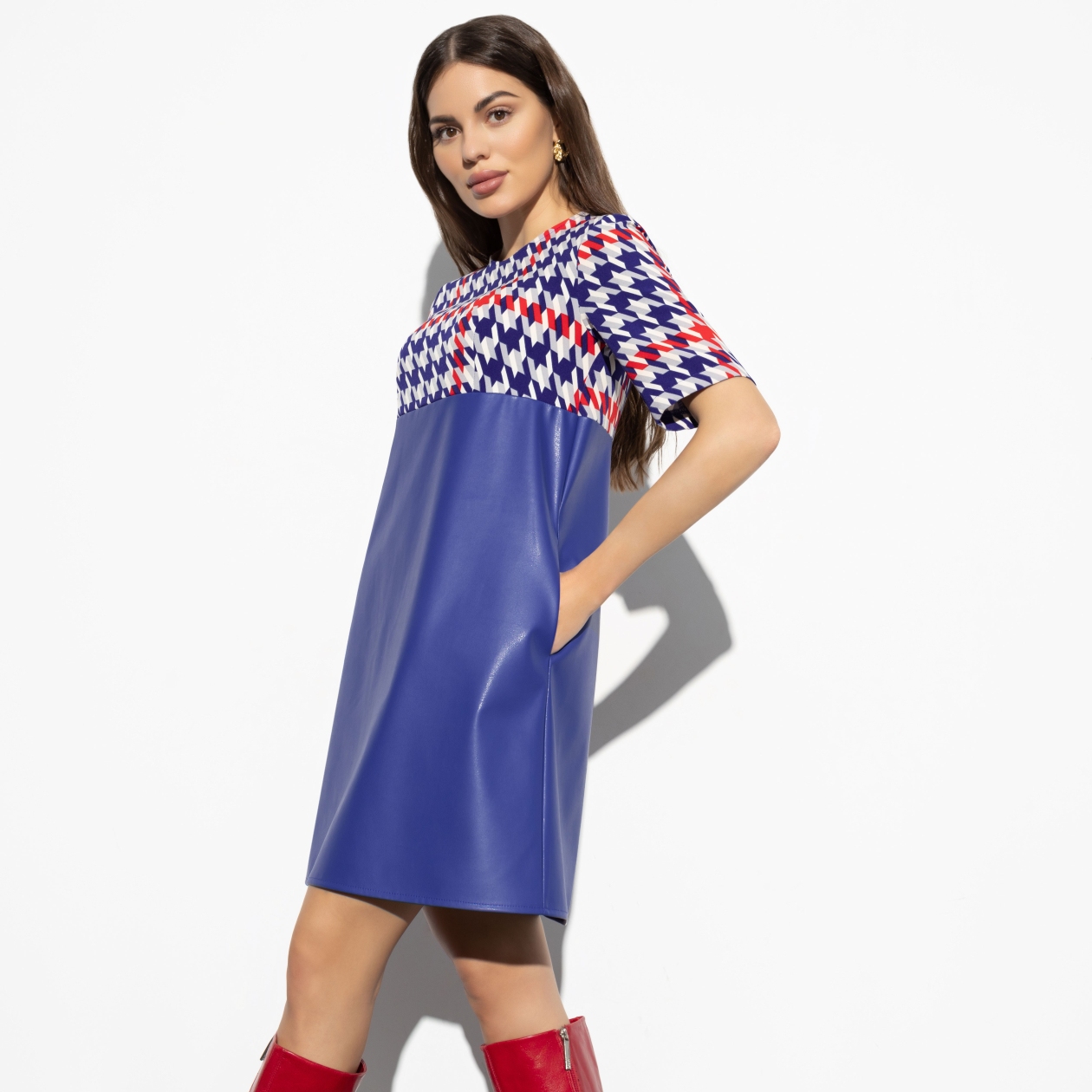 Это платье приглашали на интервью. Чтобы узнать, каково это сочетать в себе трендовый цвет, модную экокожу и акцентный принт в зоне плеч и декольте. Но, к сожалению, у него нет времени, платье спешит к вам.