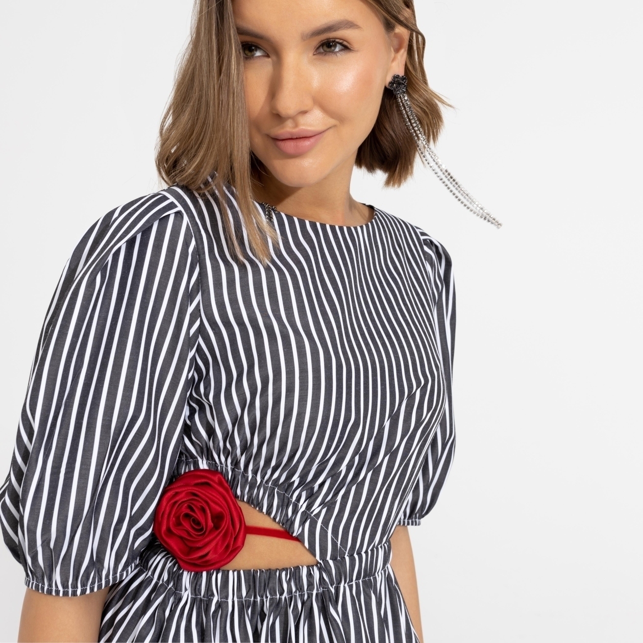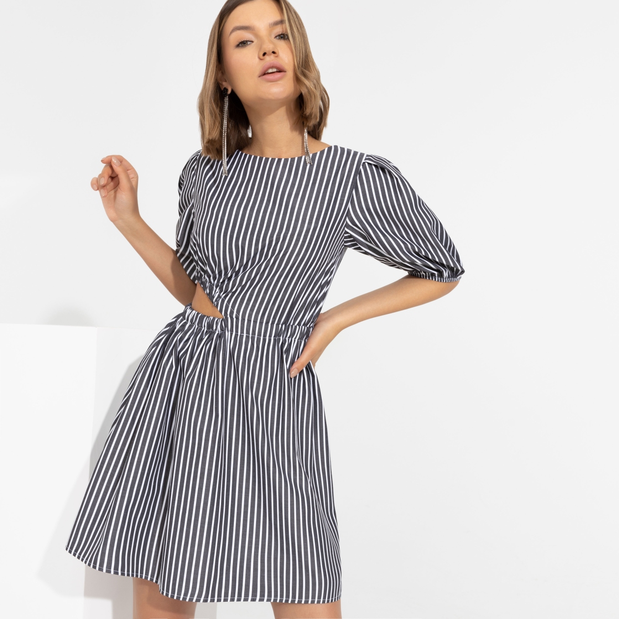 Иногда об одном мгновении мы вспоминаем долгие годы. Чтобы таких моментов было больше, наполни каждый день деталями. Эффектное платье-мини в полоску с пикантным трендовым разрезом – то, что нужно.