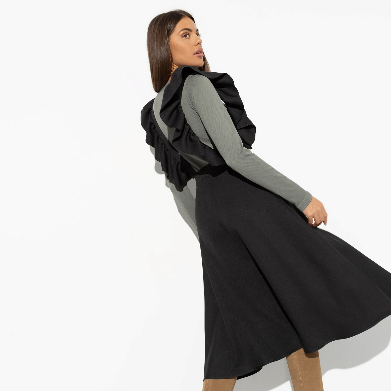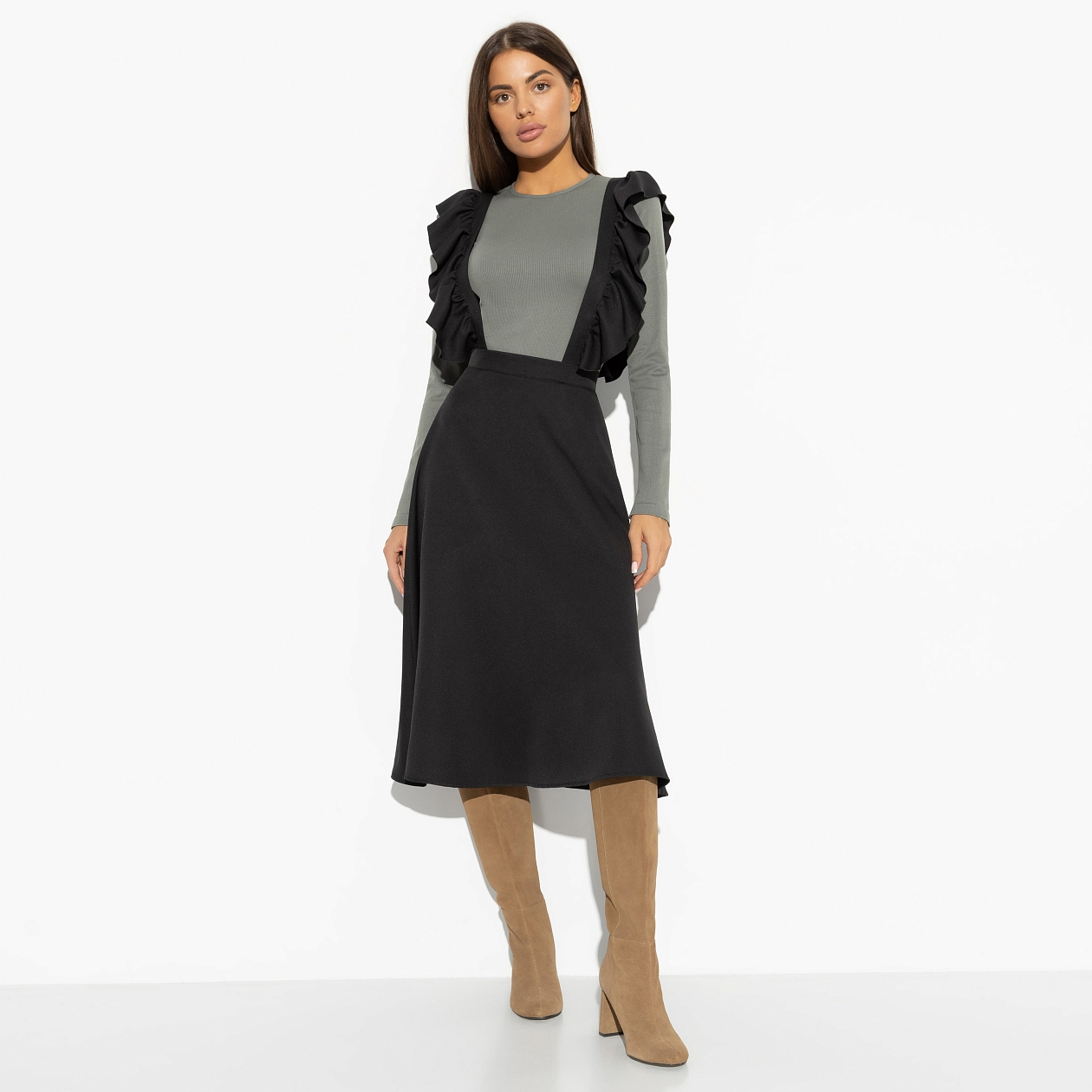 Одним из ключевых преимуществ этого сарафана являются съёмные лямки, которые крепятся на пуговицы. Это позволяет легко адаптировать изделие под разные образы и носить его не только как сарафан, но и как юбку. Игривые рюши добавляют модели динамичности и женственности, а скрытый замок на юбке по задней части изделия обеспечивает удобство и завершённость образа.