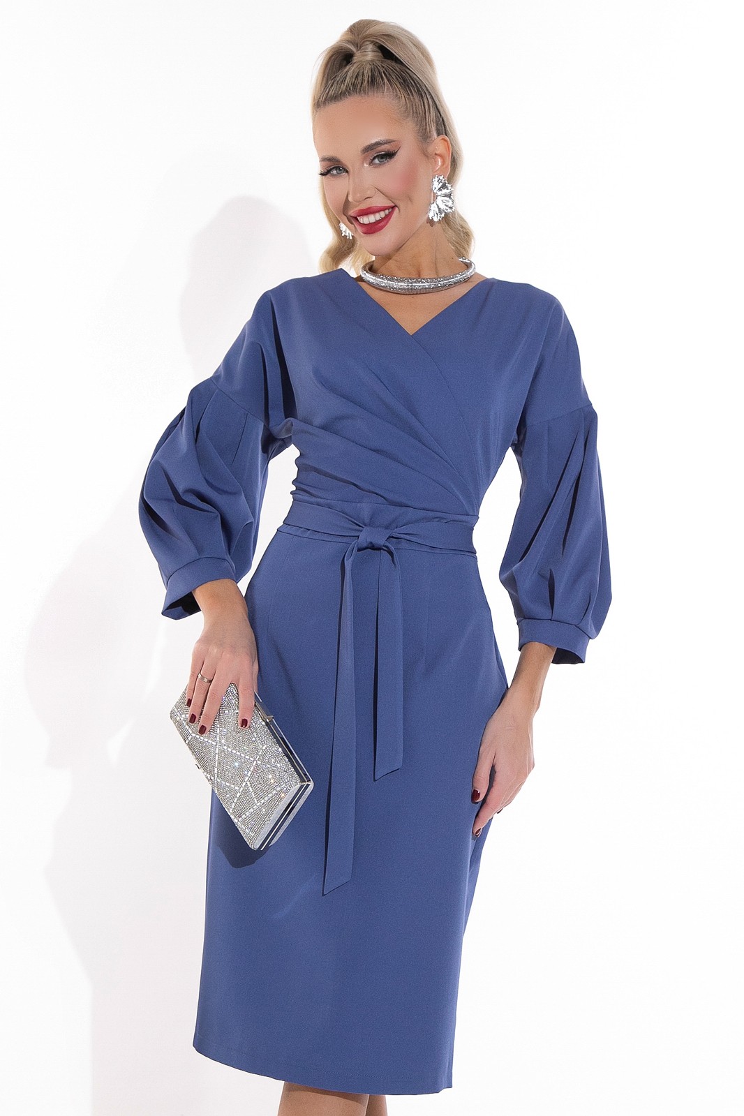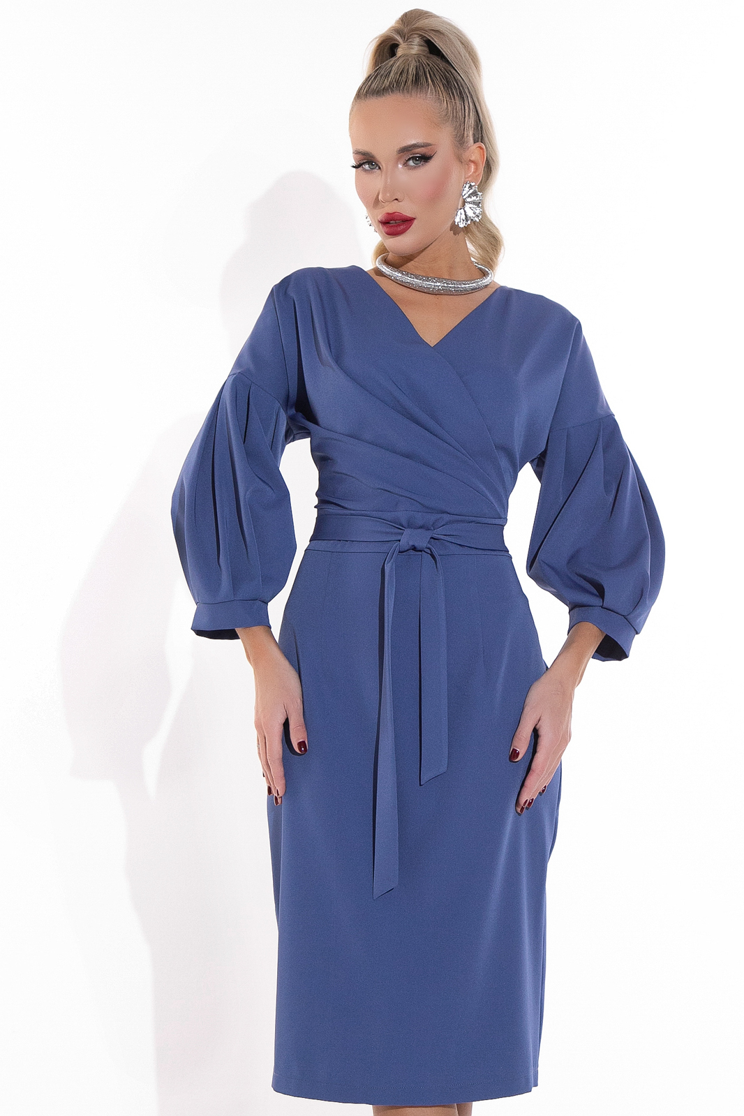 Модель приталенного силуэта из плательной ткани с v-образным вырезом на груди. Актуальное сочетание объемных рукавов и облегающего силуэта отражают последние тенденции моды. Идеально подойдет для типа фигуры “песочные часы”. По спинке замок. Пояс втачен в боковые швы на уровне талии. Рекомендуем заказывать в размер. Вы будете настоящей звездой любого торжества.