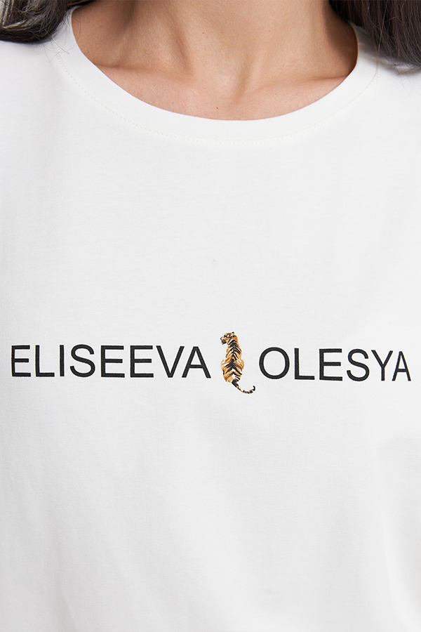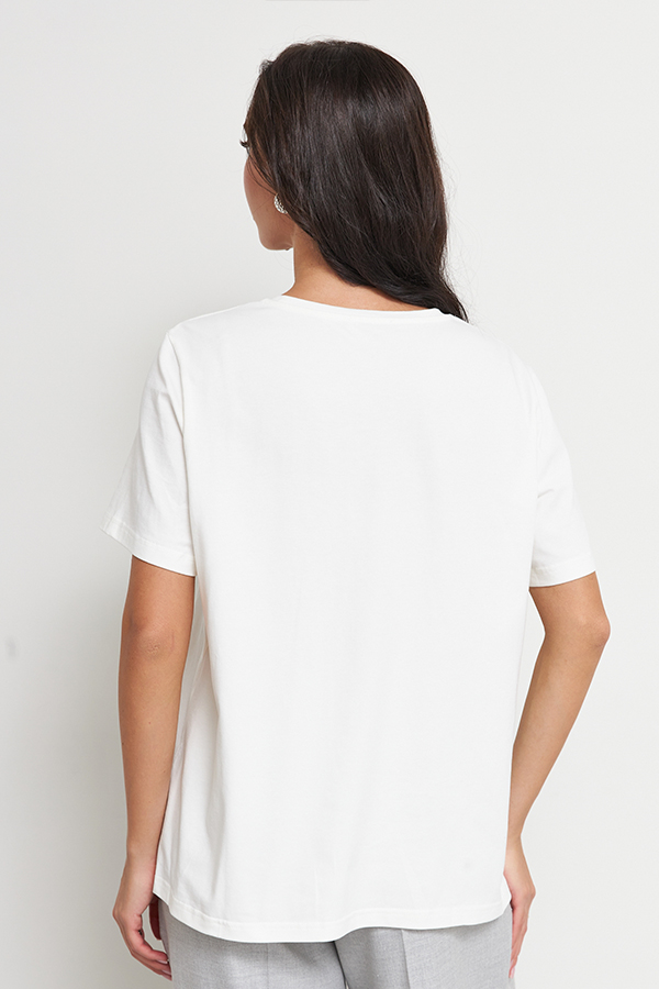 Джемпер свободного силуэта из хлопкового эластичного полотна. Втачной короткий рукав. Круглый вырез горловины оформлен бейкой. На передней части изделия нанесён принт методом шелкографии.