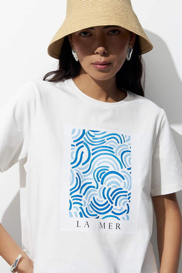 Джемпер из хлопкового эластичного полотна свободного силуэта. Втачной короткий рукав. Круглый вырез горловины оформлен бейкой. На передней части изделия нанесён принт методом шелкографии.