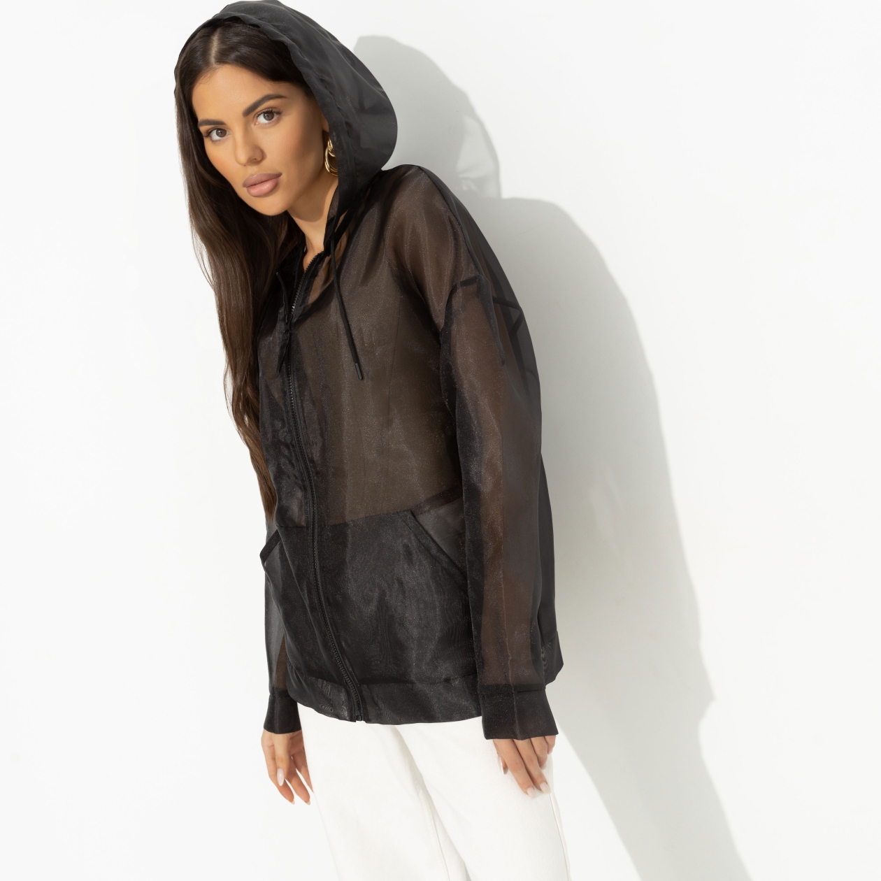 В детстве ты была «своей в доску». Играла с мальчишками, получала ссадины, носила худи и прыгала с тарзанки. Время прошло, и ты стала женственной. Но по-прежнему обожаешь худи. В новой версии тебя – прозрачное от CHARUTTI. Худи свободного силуэта. Материал изделия прозрачный. Есть карманы. Линия плеча спущена, рукав чуть заужен. Изделие с капюшоном. Худи застегивается на молнию в тон изделия.