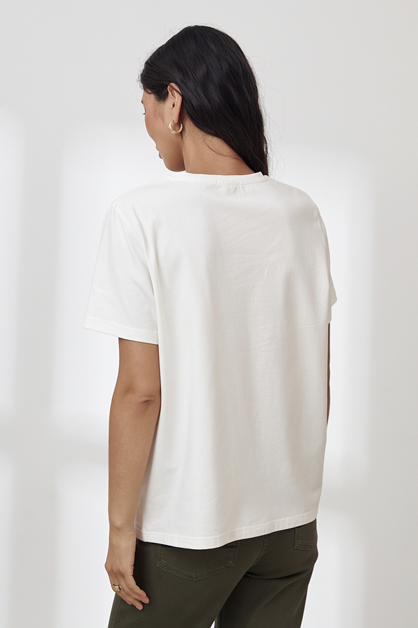 Джемпер из хлопкового эластичного полотна свободного силуэта. Втачной короткий рукав. Круглый вырез горловины оформлен бейкой. На передней части изделия нанесён принт методом шелкографии.