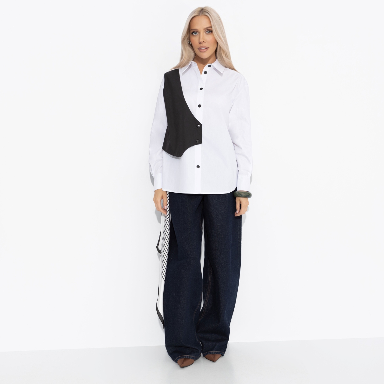 Рубашка ЧАРУТТИ – манифест скрытых амбиций и силы, которую ты носишь с собой каждый день. Её нетривиальный крой — архитектурный проект твоего будущего «я», где асимметричные детали и смелые линии символизируют отказ от шаблонов. В ней ты чувствуешь, как границы между мечтой и реальностью стираются. Рубашка удлиненная прямого силуэта. Акцентные детали по одной стороне изделия прошита. Имитация части жилета. Изделие застегивается на пуговицы контрастного цвета. Можно носить в заправленном виде.