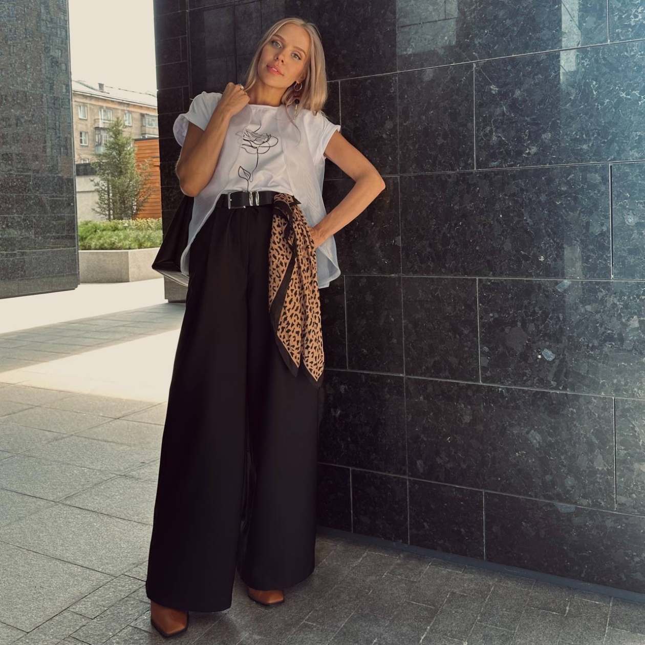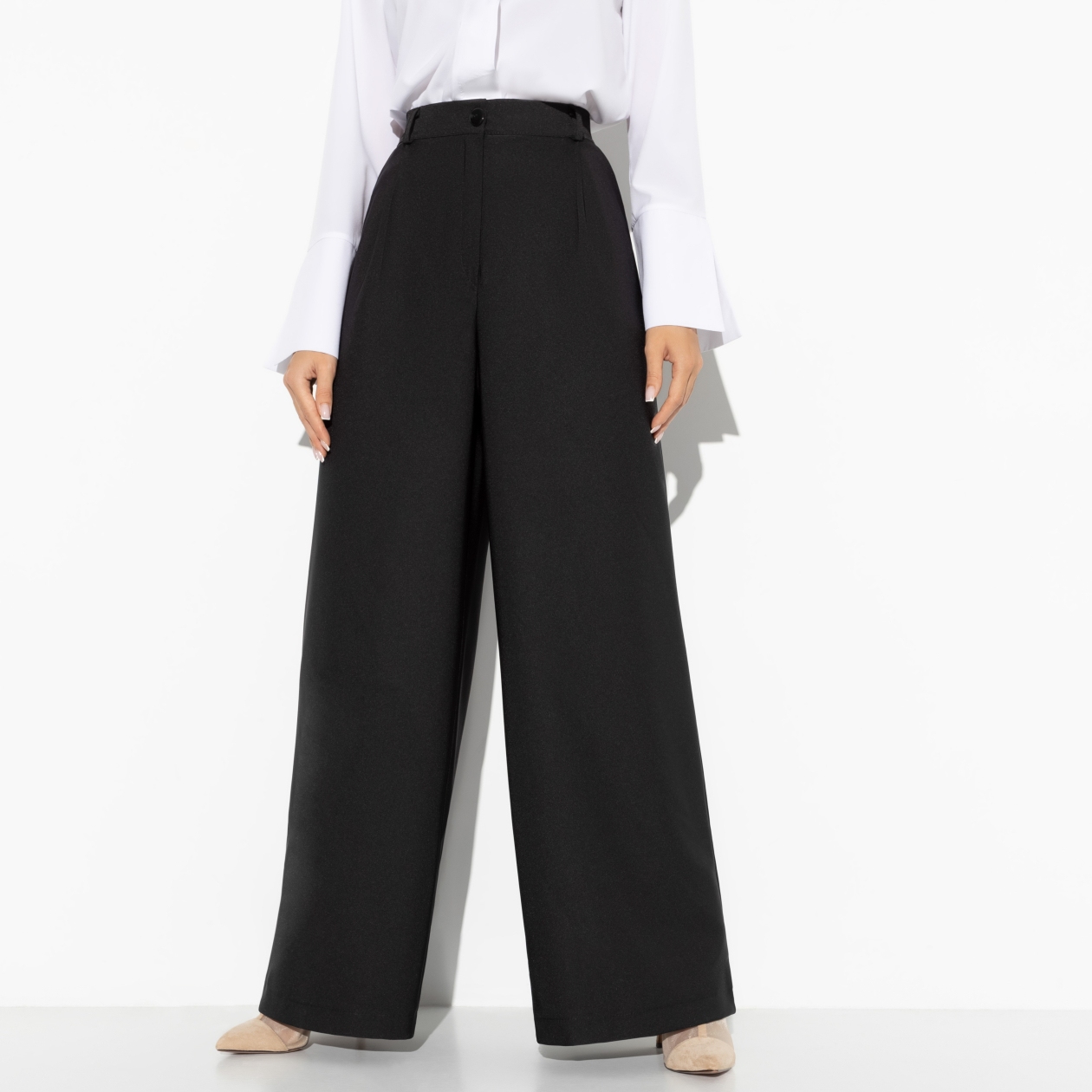 Палаццо как стиль жизни. Свободный расслабленный силуэт принял деловую форму. Шлейф итальянского побережья будет сопровождать вас весь трудовой день. Брюки широкие. Высокая посадка на талии. Пояс классический со шлевками, на пуговице и молнии. Есть карманы.