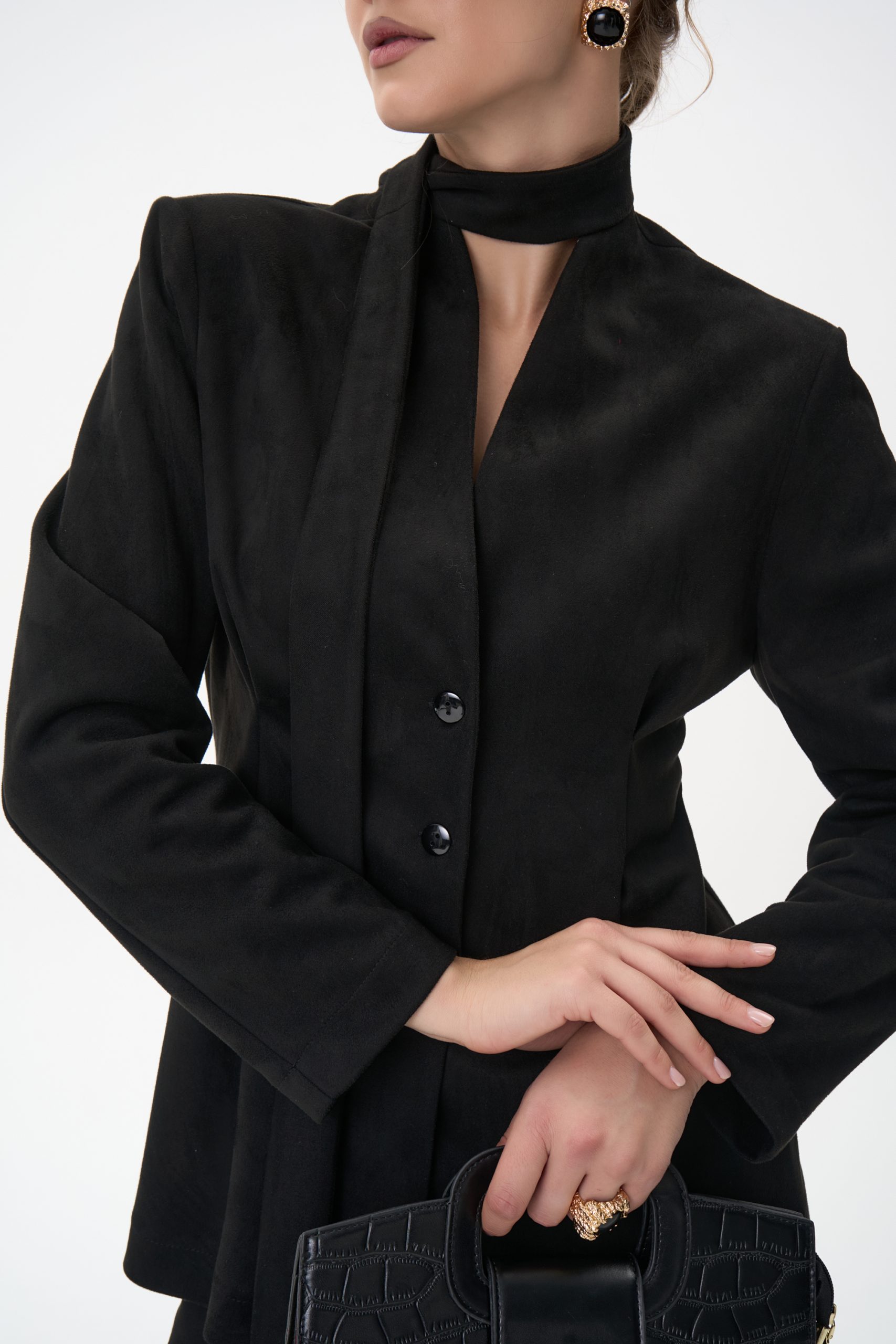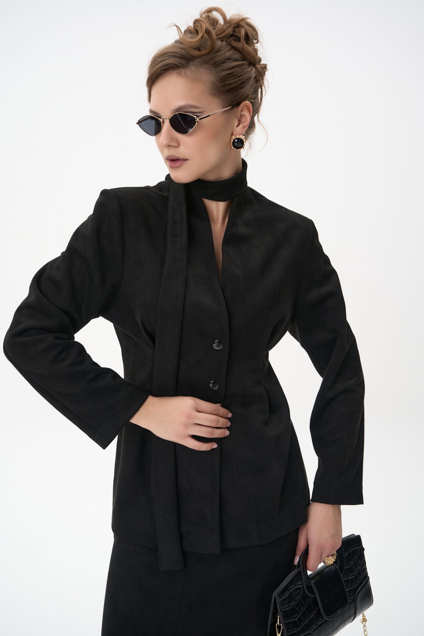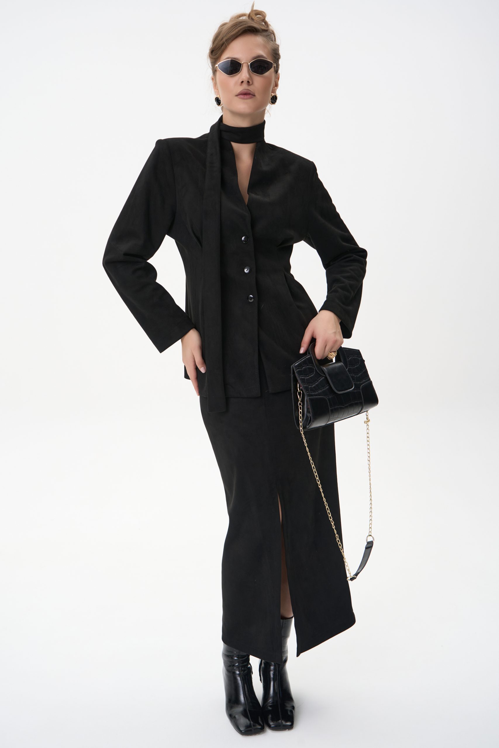 Костюм из мягкой замшевой ткани в двух оттенках — глубокий чёрный и природный оливковый. Лаконичный жакет в паре с прямой юбкой формируют чистый силуэт и создают образ современной элегантности. Структурированная форма сочетается с мягкой тактильностью ткани, делая комплект универсальным выбором для офиса, встреч и вечерних выходов. Минималистичные линии, продуманная посадка, сдержанный акцент на текстуру — костюм, который работает за вас.