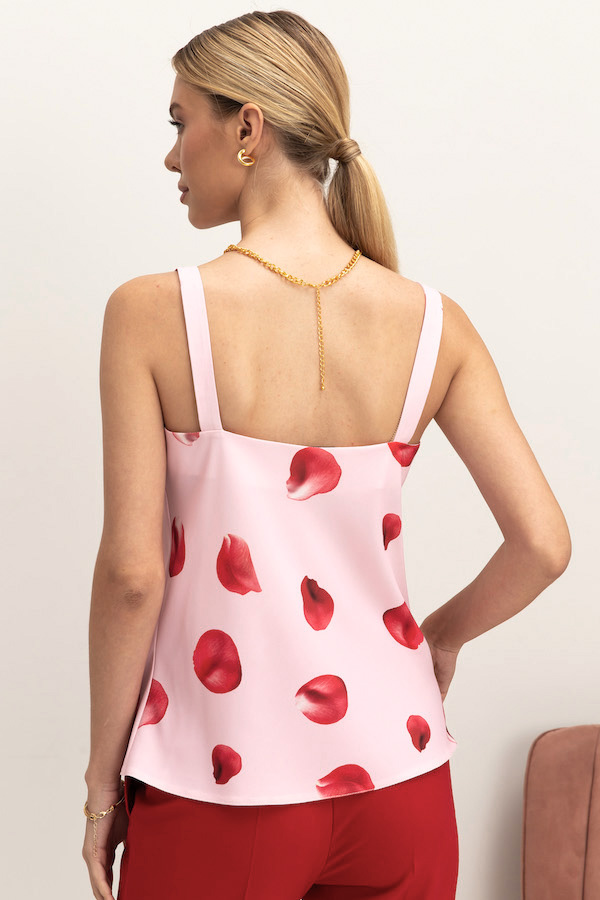Топ с «качелями» в зоне декольте смотрится очень женственно. Изделие на бретелях полуприлегающего силуэта из блузочной ткани.