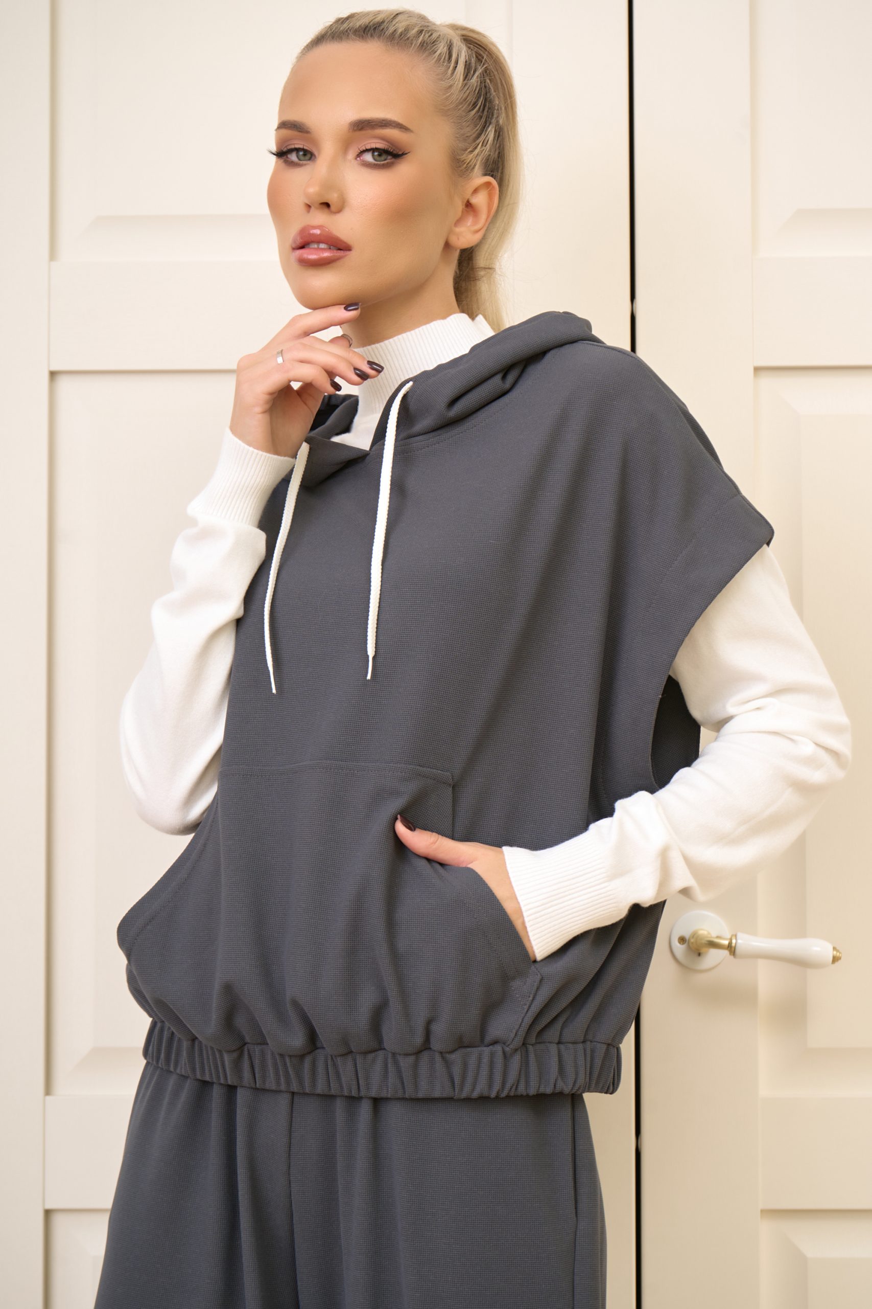 Капюшон: Особое внимание привлекает капюшон с уникальной деталью — привлекательными завязками, которые добавляют костюму дерзости и оригинальности.