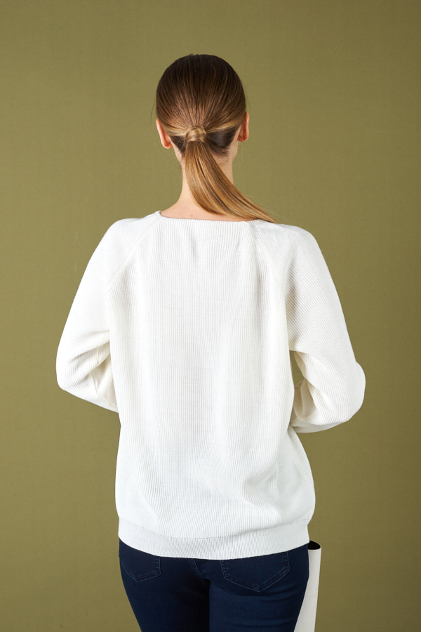 Джемпер прямого силуэта с фактурой «жемчужный узор». Рукав реглан. V-образный вырез горловины. Низ изделия и низ рукава оформлены резинкой. Изделие выполнено из мягкой структурированной пряжи.