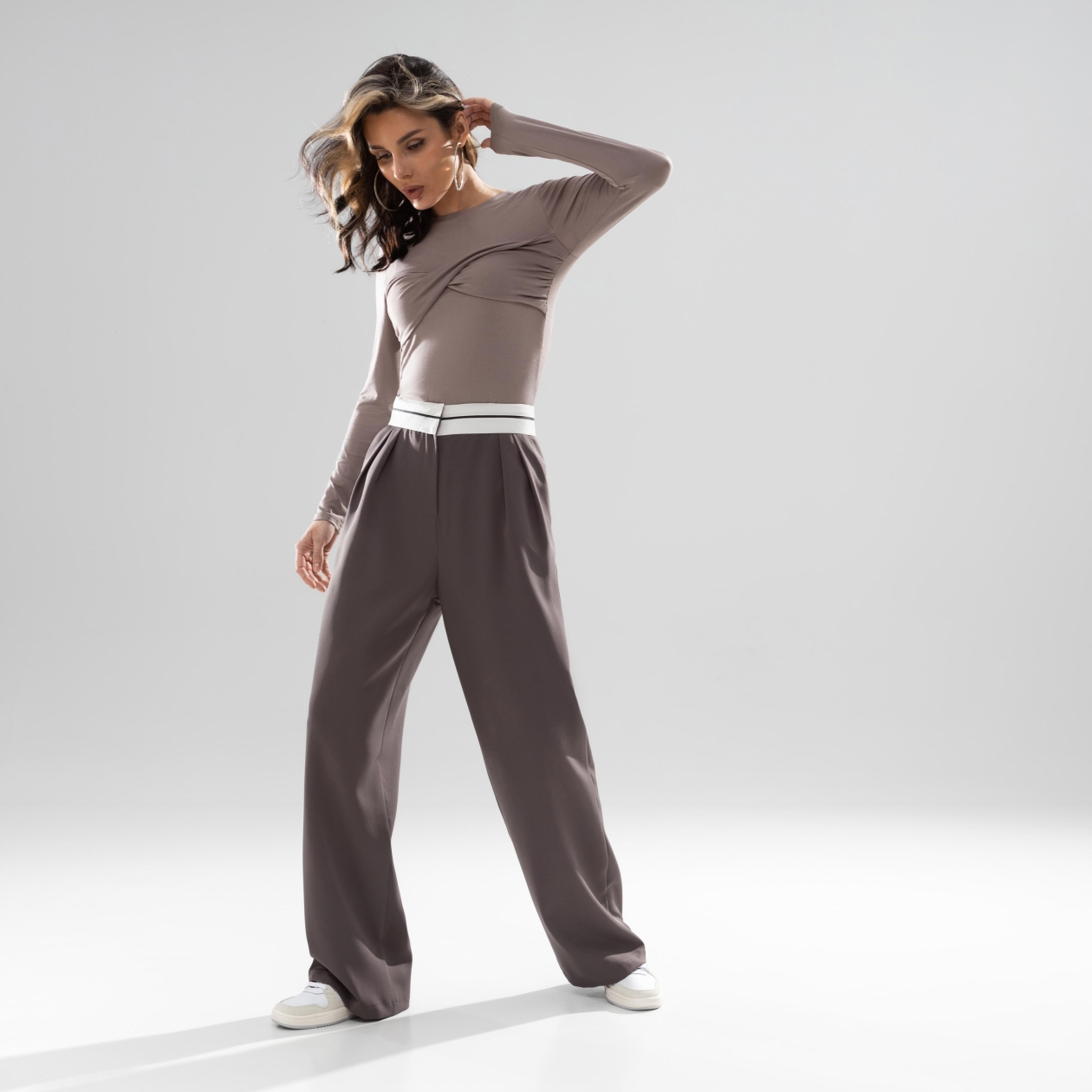Для тех, кто действительно разбирается в моде – брюки свободной посадки в глубоком коричневом цвете. Контрастная линия пояса в сочетании с безупречным кроем позволит вам чувствовать себя уверенно и элегантно.